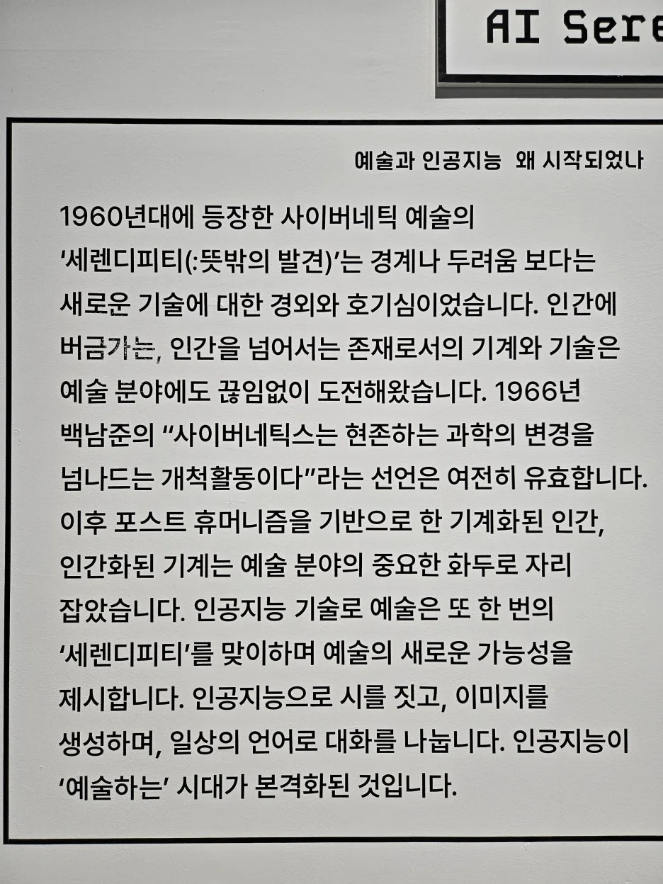 이 전시를 통해 관객 여러분이 인공지능과 예술의 관계에 대해 더 깊은 성찰을 하길 바랍니다. 예술과 기술의 경계에서 우리는 여전히 질문하고, 탐구하며, 창조할 것입니다. - 이 ‘에필로그’는 앞의 전시 내용을 바탕으로 Chat-GPT4가 작성한 글의 일부를 각색한 것입니다.