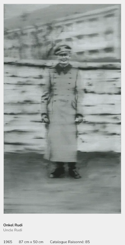 이 책을 통해 이 작품들이 단순한 가족의 초상이 아니라, 리히터의 개인사와 독일 현대사의 상흔이 녹아든 깊은 서사를 담고 있다는 것을 알게 되었다. <마리안느 이모>는 나치 독일의 정책에 희생된 이모가 소녀일 때 아직 어린 리히터와 찍은 사진을, <루디 삼촌>은 나치로 활동하다가 전사한 삼촌이 군복을 입고 찍은 사진을 바탕으로 제작된 회화다. 이 두 작품은 내막을 모르고 보면 그냥 초점을 흐린 사진 회화이지만 그 속에 역사적·개인적 복합성을 고스란히 담겨 있는 작품이었다.