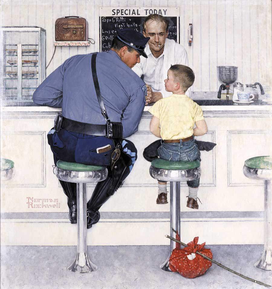 미국의 인기 일러스트레이터 노먼 락웰 (Norman Rockwell : 1894-1978)은 장장 47년간 가벼운 오락 잡지인 Saturday Evening Post의 삽화를 그렸는데, 그 삽화의 주제는 대부분 미국의 보통 사람들이 사는 일상의 모습을 따뜻한 시각으로 바라보며 그려냈고, 그의 작품은 대중적으로 큰 인기를 누렸다. 그런 그의 화풍에 혹자는 '설탕을 바른 그림' 즉, 현실을 외면한 채, 이상적 사회로 미화해서 그린다는 비판을 하기도 했는데, 그런 문제는 작가 자신도 느꼈던 듯 하다. 만년의 그는 '세터데이 이브닝 포스트' 지를 떠나 그보다는 좀 더 시사문제를 다루는 '룩'이라는 잡지의 삽화를 맡게 되는데, 그 중의 하나가 이 작품인 것이다.