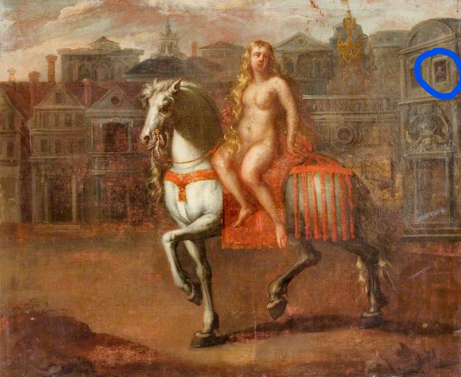 고디바 부인을 주제로 한 작품으로는 가장 오래된 작품. 숭고한 고디바 부인의 희생에 백성들은 자발적으로 모두 집에 들어가 창을 닫고 그녀의 수치심을 덜어주고자 했다. 그런데...오른쪽엔 해상도가 흐려서 잘 안보이긴 하지만, 호기심 넘치는 남정네 하나가 창밖을 내다보고 있다. 이 남자는 끝내 천벌을 받아 두눈이 멀게 되었다고.