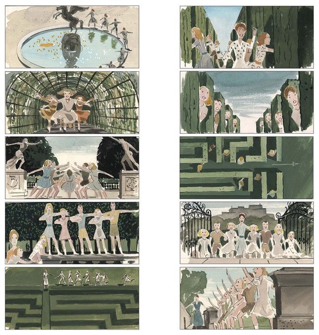 콘티 혹은 스토리보드의 예. Robert Wise 감독, Maurice Zuberano 제작의 영화 <<사운드 오브 뮤직 (The Sound of Music)>> 이 스토리보드와 함께 쥴리 앤드류스와 7명의 아이들이 넓은 정원을 가로누비며 아름다운 노래를 부르는 모습이 떠오를 것이다.