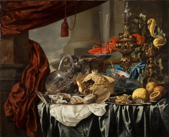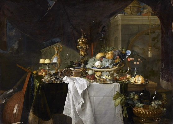 Jan Davidsz. de Heem (1606–1683/1684), A Table of Desserts (1640), oil on canvas ; 149 x 203 cm, Louvre 이러한 잔치 음식들을 그린 바니타스 정물화를 특화하여 네덜란드어로는 “Pronkstilleven”, 영어로 말하면 ‘ostentatious', 'ornate' 또는 'sumptuous' still-life라고 하는데, ‘사치스러운 정물화’라는 의미이다. 이러한 독특한 정물화는 1640 년대 앤트워프 지방을 중심으로 발전한 스타일이다.