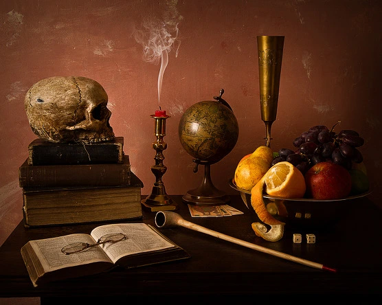 1) 가장 대표적이자 원론적인 바니타스 정물화에 주로 다루는 사물들은 단연 해골, 모래시계, 척도계, 시계, 촛불, 꽃 – 인간의 유한함, 피할수 없는 죽음을 상기시키는 대상물이다. 이를 메멘토 모리 (Memento Mori: ‘네가 반드시 죽는다는 것을 기억하라’)의 주제라고도 일컫기도 한다.