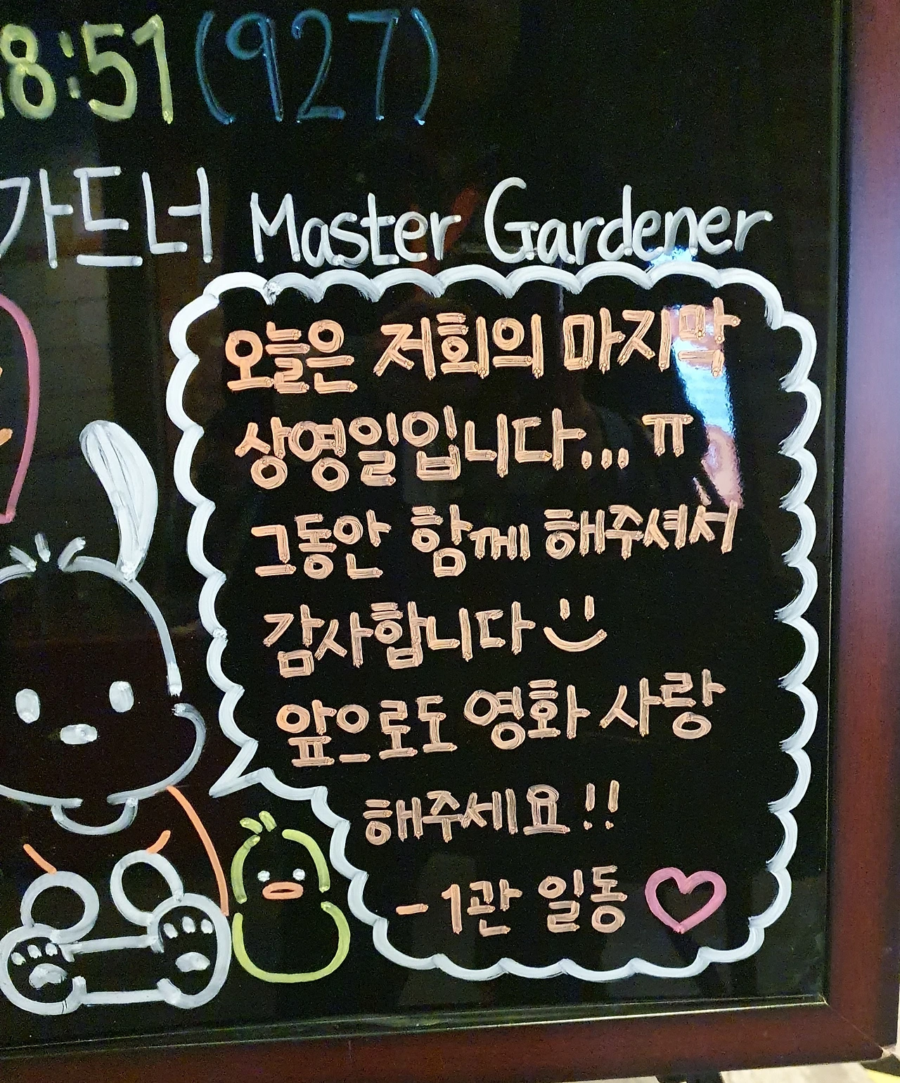 힘든 상황 속에서도 영화제는 언제까지나 영원하기를 기원합니다. 단 열흘간의 축제를 위해 관계자들은 일년 내내 준비하는 걸로 알고 있습니다. 고생하신 관계자들, 늘 밝고 씩씩한 모습으로 활기를 주는 영화제의 꽃, 젊은 자원봉사자들께도 수고하셨다는 말을 전하고 싶네요.
