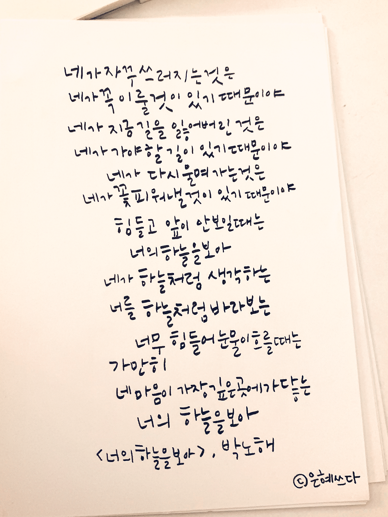 - 박노해네가 자꾸 쓰러지는 것은네가 꼭 이룰 것이 있기 때문이야네가 지금 길을 잃어버린 것은네가 가야할 길이 있기 때문이야네가 다시 울며 가는 것은네가 꽃피워 낼 것이 있기 때문이야힘들고 앞이 안 보일 때는너의 하늘을 보아네가 하늘처럼 생각하는너를 하늘처럼 바라보는너무 힘들어 눈물이 흐를 때는가만히 네 마음이 가장 깊은 곳에 가 닿는너의 하늘을 보아