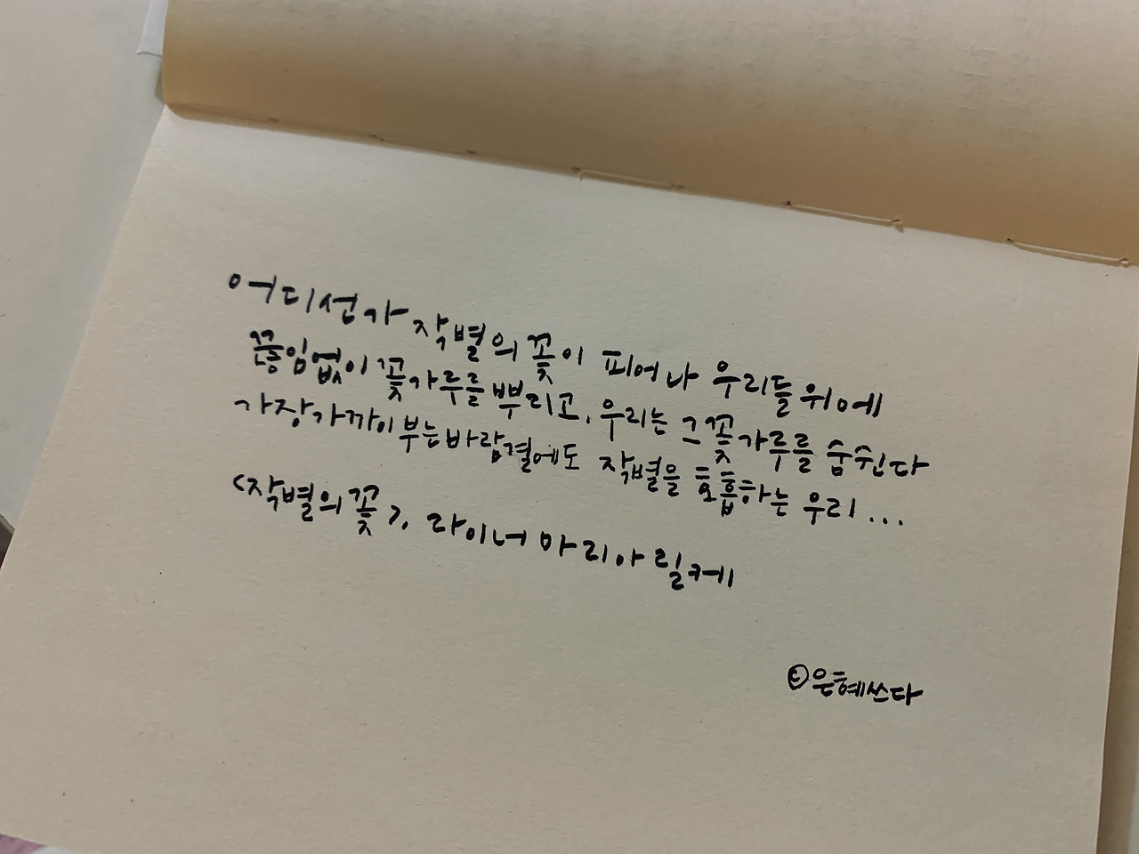 어디선가 작별의 꽃이 피어나 우리들 위에끊임없이 꽃가루를 뿌리고, 우리는 그 꽃가루를 숨 쉰다가장 가까이 부는 바람결에도 작별을 호흡하는 우리...