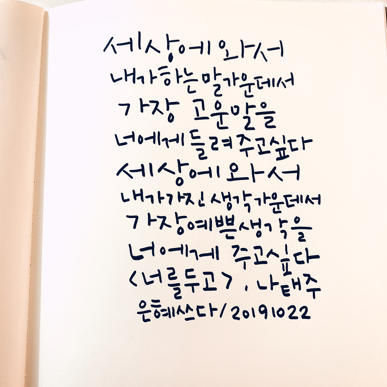세상에 와서내가 하는 말 가운데서가장 고운 말을너에게 들려주고 싶다 세상에 와서내가 가진 생각 가운데서 가장 예쁜 생각을너에게 주고 싶다