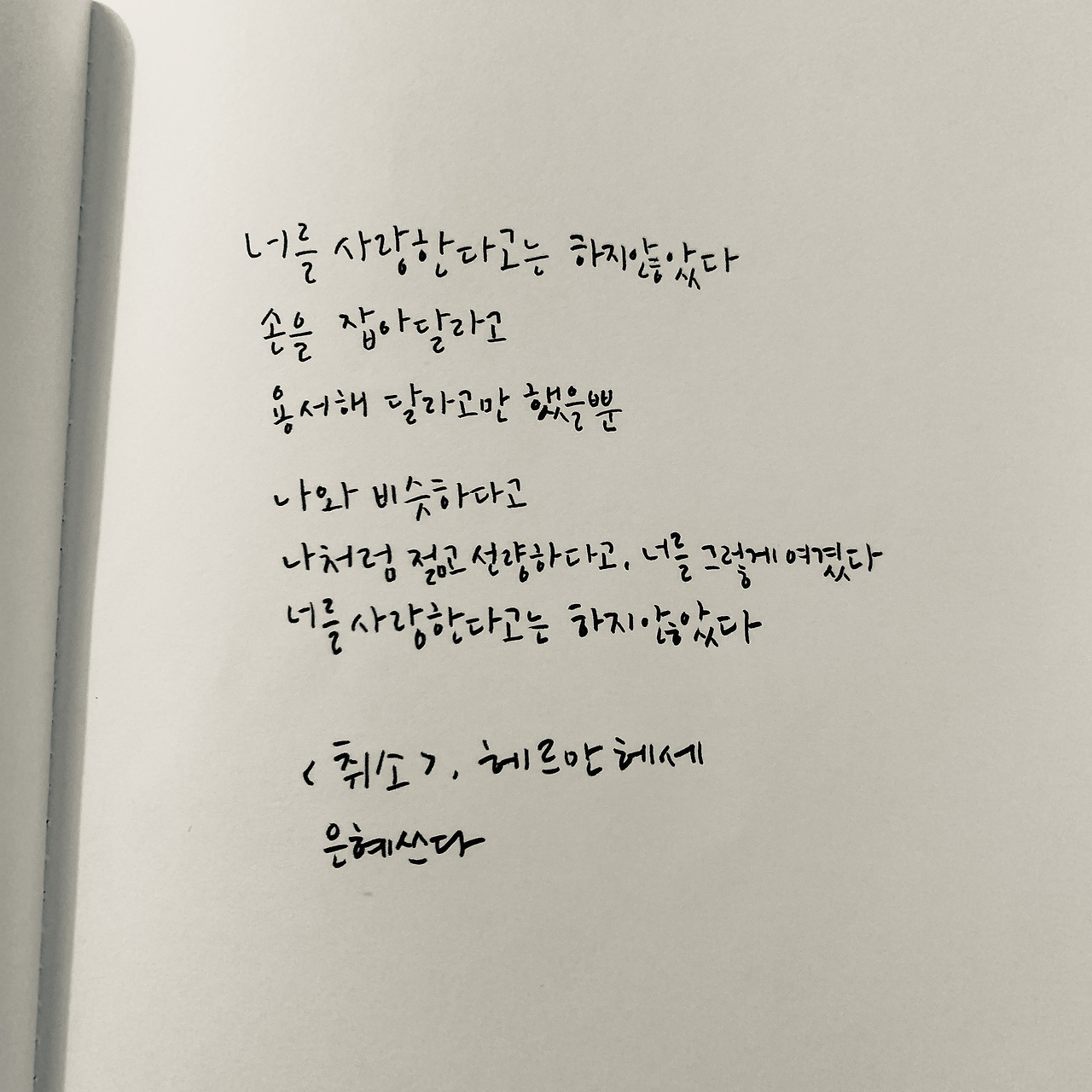 너를 사랑한다고는 하지 않았다손을 잡아 달라고용서해 달라고만 했을 뿐 나와 비슷하다고나처럼 젊고 선량하다고, 너를 그렇게 여겼다너를 사랑한다고는 하지 않았다
