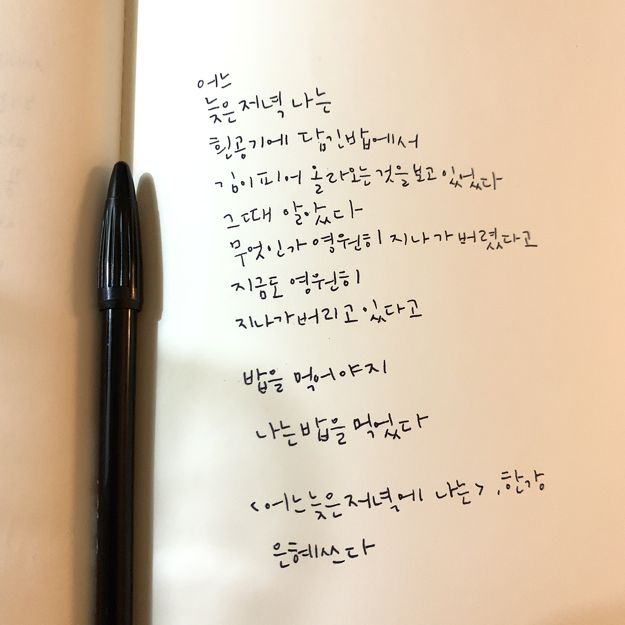 어느늦은 저녁 나는흰 공기에 담긴 밥에서김이 피어 올라오는 것을 보고 있었다그때 알았다무엇인가 영원히 지나가버렸다고지금도 영원히지나가버리고 있다고 밥을 먹어야지 나는 밥을 먹었다