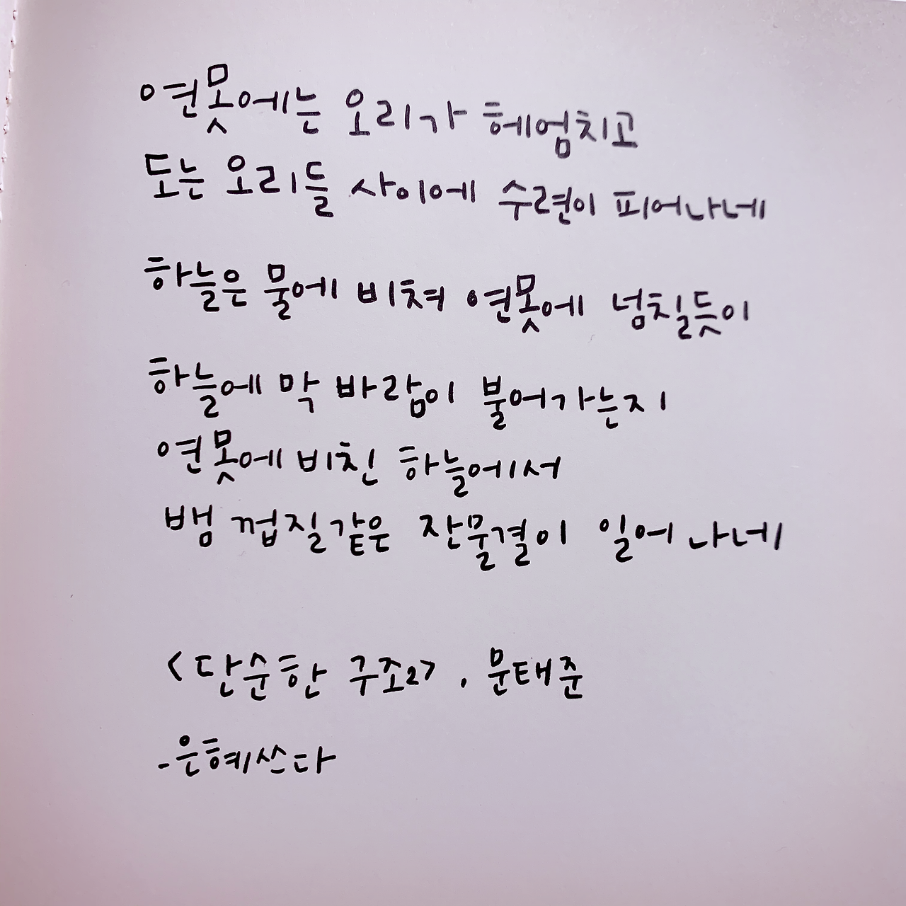 연못에는 오리가 헤엄치고 도는 오리들 사이에 수련이 피어나네