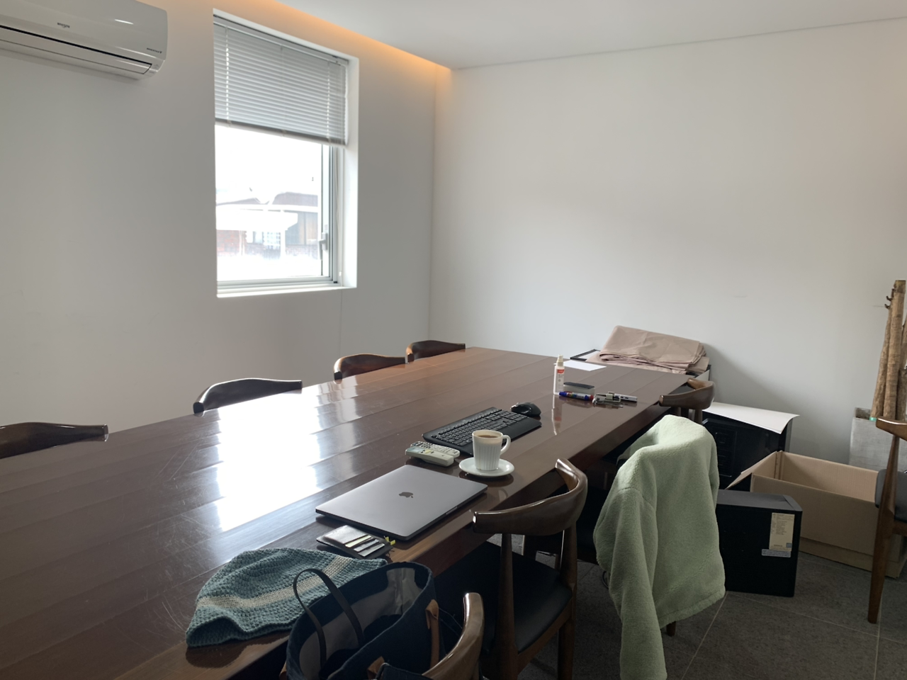 여튼 그렇게 멀리 이동해서 넓은 책상이 있는 회의실을 단독으로 쓰게 됐다. 좀 작을 거라 생각했던 책상이 10인 회의실 규모로 큰 책상인 것, 창이 딱 하나 볕이 드는 쪽으로 나 있는 것, 책상 대비 공간이 크게 남지 않는 것도 집중하기 좋은 공간인 느낌이었다. 의자도 높이가 좋고, 책상 나무도 어두운 색상이라 정말 딱, 내 모니터에만 집중하기가 좋았다. 역시 공간을 생각하는 분들이 만든 곳이라 회의실마저도.. 회사생활을 나름 하면서 숱한 회의실을 만났지만 이렇게 집중이 잘 되는 공간은 처음이었다.