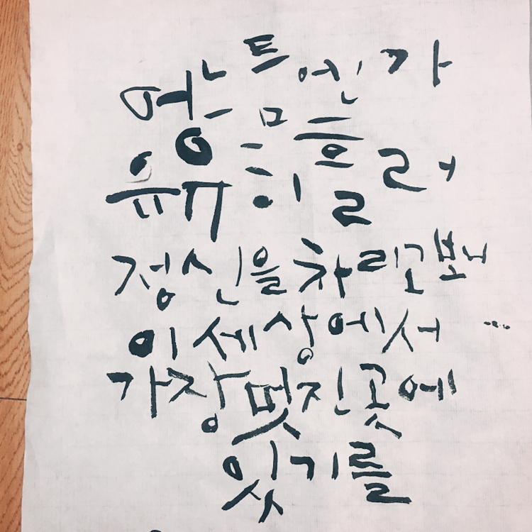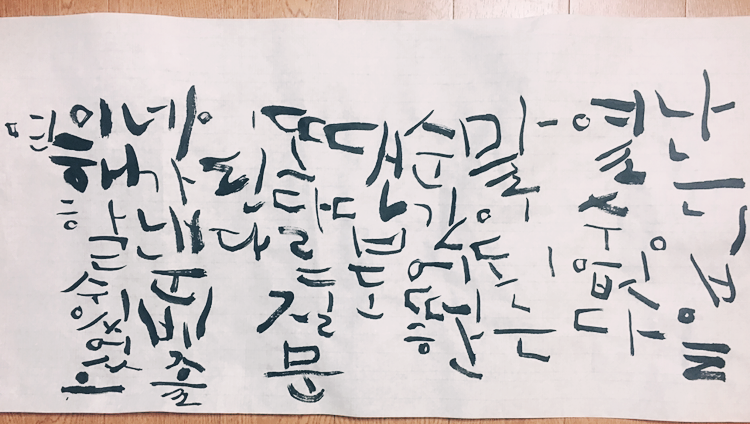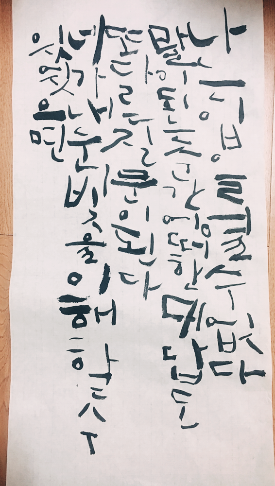 형태를 따라쓰기 급급했던 첫 번째와 달리 두 번째에는 자음과 모음이 위치한 곳을 더 자세히 들여다보게 되었습니다. 어렵지만 이게 훈련인가 싶어서 골똘히 생각하다가 조금씩 변형하게 된 것도 있는데, 저는 그냥 지금 제 컨디션과 미미한 의도가 있을 뿐이라 (...) 그냥 '아이구, 한 장을 다 썼다니 참 대단하다' 정도로 마무리 하렵니다. 아이고 팔이야. ㅠ