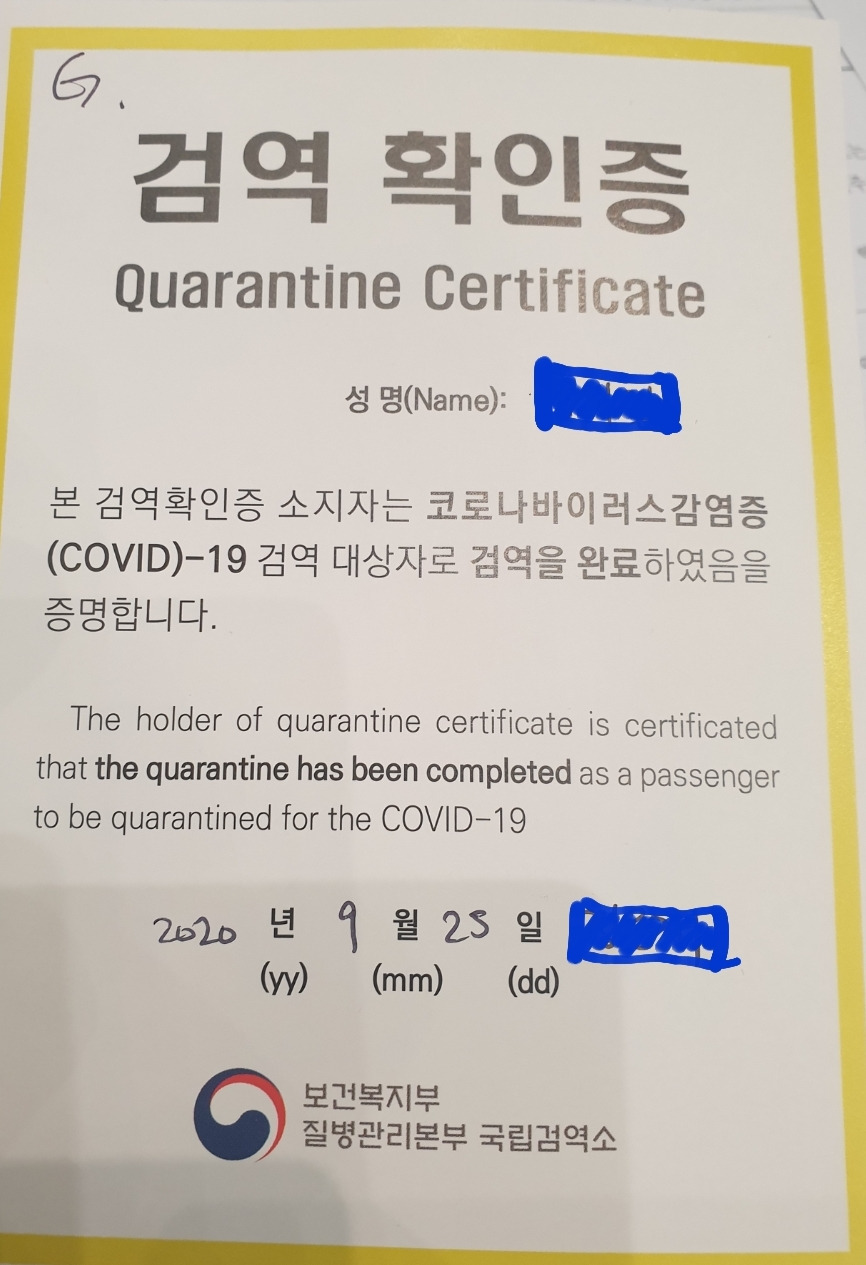 두번째 입국 경험담이다. 300명 타는 비행기에 50명이 채 안되는 승객이 충분한 거리두기와 마스크 착용상태에서 탑승했다. 지난번 해외입국 절차와 자가격리 절차가 이번과 크게 차이는 없다. 입국 절차는 (1) 기내에서 3장의 종이를 나누어 주고(노란색, 하얀색, 그리고 세관신고서)이다. 기내에서 작성해 두면 편하다. 노란색은 건강상황조사표이고, 하얀색은 특별검역서이며, 14일간 방문국가 등등에 대해서..(2) 노란 종이(건강상황 조사표)로서 입국장에 도착해서 제일 먼저 수거한다. 체온을 체크하고 나서 (3) 검역 확인서를 발급해 준다. 안내에 따라가면 육군지원단 청년들이 검역 확인서를 확인하고 「자가격리안전앱」 어플” 설치 도움을 준다. 설치되어 있다면, 통과해서 (4) 특별 검역서를 제출하고 전화로 「자가격리 안전 앱」의 작동을 확인한다. 확인 끝나고 안내에 따라 나오면 (5) 2장의 격리 통지서와 격리 통지서 수령증을 받아 이름과 자가격리 장소 등을 기록한다. 격리 통지서 수령증은 제출하고, 격리 통지서는 보관하면 된다. (6) 입국심사를 받고 나와서 짐을 찾고, (7)세관을 통과하면서, 세관서류를 제출하고 입국장으로 나오면 방호복을 입고 계신 분들이 서 있다. (8) 자가격리와 시설 격리를 확인하고, 시설일 경우 안내를 받는다. 자가 격리의 경우 (9) 다음 단계로 가면, 자가격리 장소를 확인하고 팔 쪽에 스티커를 붙여준다. (10) 자가격리 장소 이동을 택시/버스 중에 선택하고, 버스탑승시 별도의 공간에 버스가 올때까지 대기 장소로 가면 된다. 택시일 경우 대기하고 계신 기사님을 호출해서 함께 승차안내 데스크로 이동하여 택시비(서울시내 기준 8만 원)에 대한 안내를 받는다. 택시를 타면, 거주지 관할 보건소로 먼저 이동하고, 검사 후에 집으로 귀가하게 된다. 다만 보건소 업무시간일 경우 보건소로 이동하나, 업무시간외에 도착할 경우에는 집으로 귀가하고 24시간 이내 코로나 19 검사를 받아야 한다.