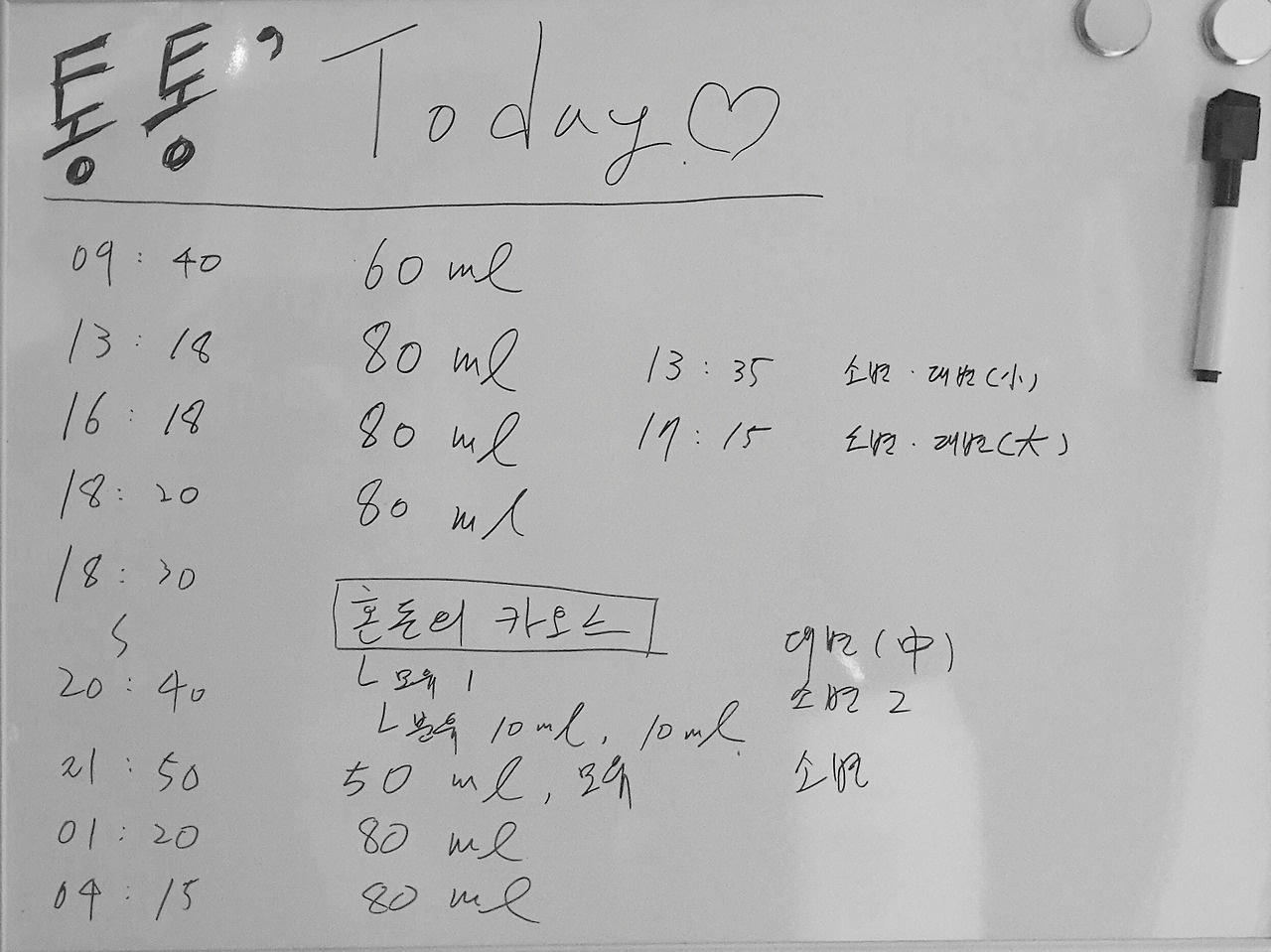 밤중 수유 타이밍을 놓칠까 알람을 맞춰야 하나 고민했는데 기우였다. 아이는 3시간이 지나면 으레 끙끙거렸고, 나는 신기하게도 그 소리에 자동적으로 눈이 떠졌다. 10시에 한번, 1시에 한번, 4시에 한번, 7시에 또 한 번. 군 복무할 때 행정 계원이 이런 식으로 내 경계 근무를 짰다면 흡연실로 조용히 불러냈을 것이다. 물을 데우고, 분유를 타고, 젖병을 씻고 하는 일이 처음에는 조심스럽다가 어느 순간 기계처럼 손이 움직였다. 다행스러운 것은 아이가 내 어깨에 기대면 바로 트림을 해준다는 것이다. 34년 만에 처음으로 좁은 어깨가 고마운 순간이다.