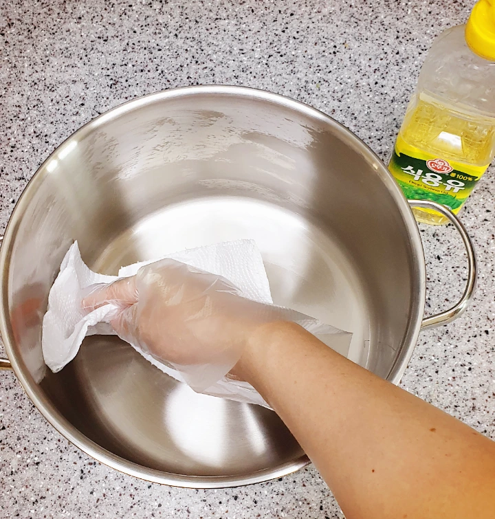 1. 새로 산 열탕 소독용 냄비를 식용유로 닦아서 연마제를 제거한다.