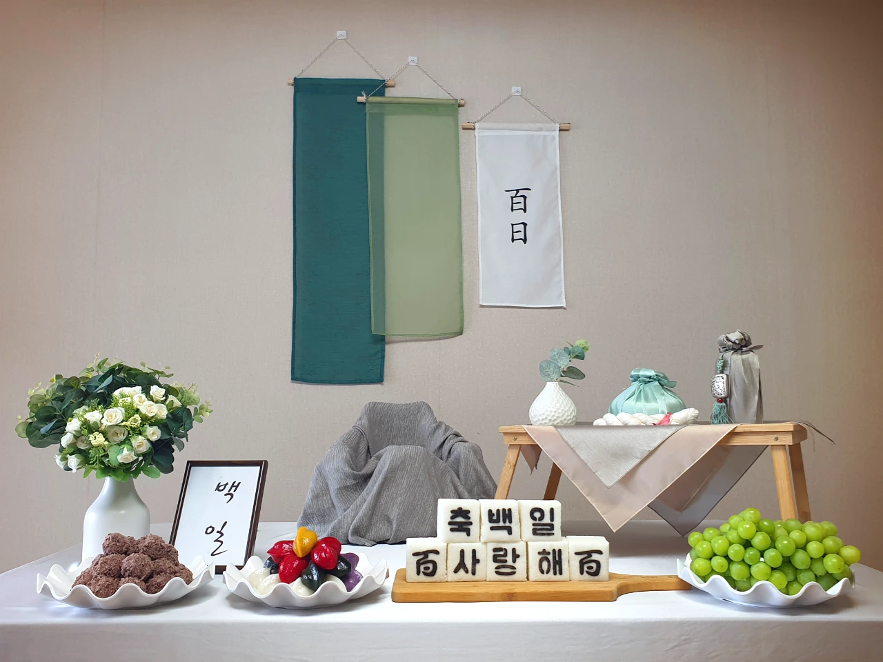 백일을 치렀다. 아침 일찍 차를 몰고 빌라촌 사이에 있는 작은 떡 카페에서 백일떡을 찾아왔다. 색색깔 송편에 백설기 그리고 수수떡까지 아기자기한 포장지에 담겨 나왔다. 그동안 아내는 식탁 위를 정리하고, 대여한 백일상 소품과 고향에서 '모셔' 온 샤인머스캣(한 송이당 1만 원이 넘는다는!)도 한 송이 올렸다. 모든 것이 계획한 대로 예쁘게 꾸며졌다.