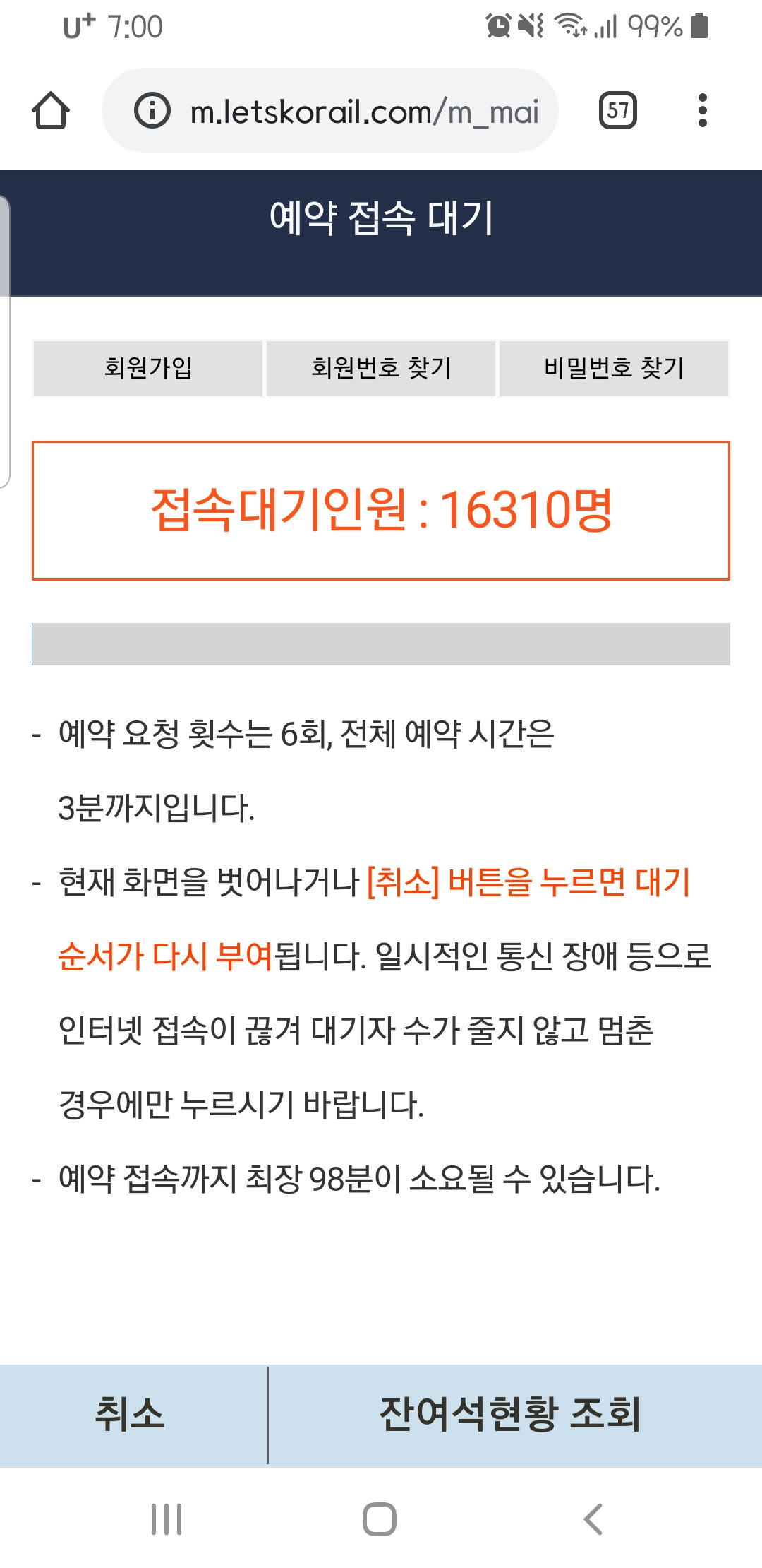 아침 7시를 조금 남긴 시각. 비구름 덕에 아직 어스름이 짙게 깔렸고, 고요한데 빗소리만 타닥거렸다. 깜깜한 거실에서 노트북 모니터를 켜고 코레일 사이트에 접속했다. 하얀 불빛 아래 이제 곧 소리 없는 경주가 시작되려 했다. 전자시계가 06:59에서 07:00으로 넘어가자 그 숫자를 짐작할 수 없는 양의 선수들이 저마다 호흡을 멈추고 기도하듯 손가락을 움직였다. 이윽고 심장이 한번 뛸 정도의 시간을 두고 나와 1만 6천 여명의 순위가 전광판에 띄워졌다. 짧디 짧은 한 판이었다. 숫자는 더디게 차감하고 그에 맞춰 사물의 윤곽이 조금씩 드러났다. 나는 아직 잠들어 있는 아내가 깰까 봐 숨을 죽이며 출근 준비를 하고 다시금 모니터 앞에 앉았다. 기다리는 일은 언제나 초조하고, 설레고, 또 한편으로는 지루하다. 더군다나 누군가를 만나러 가기 위해 반대로 기다리는 일은 물어 무엇하랴.