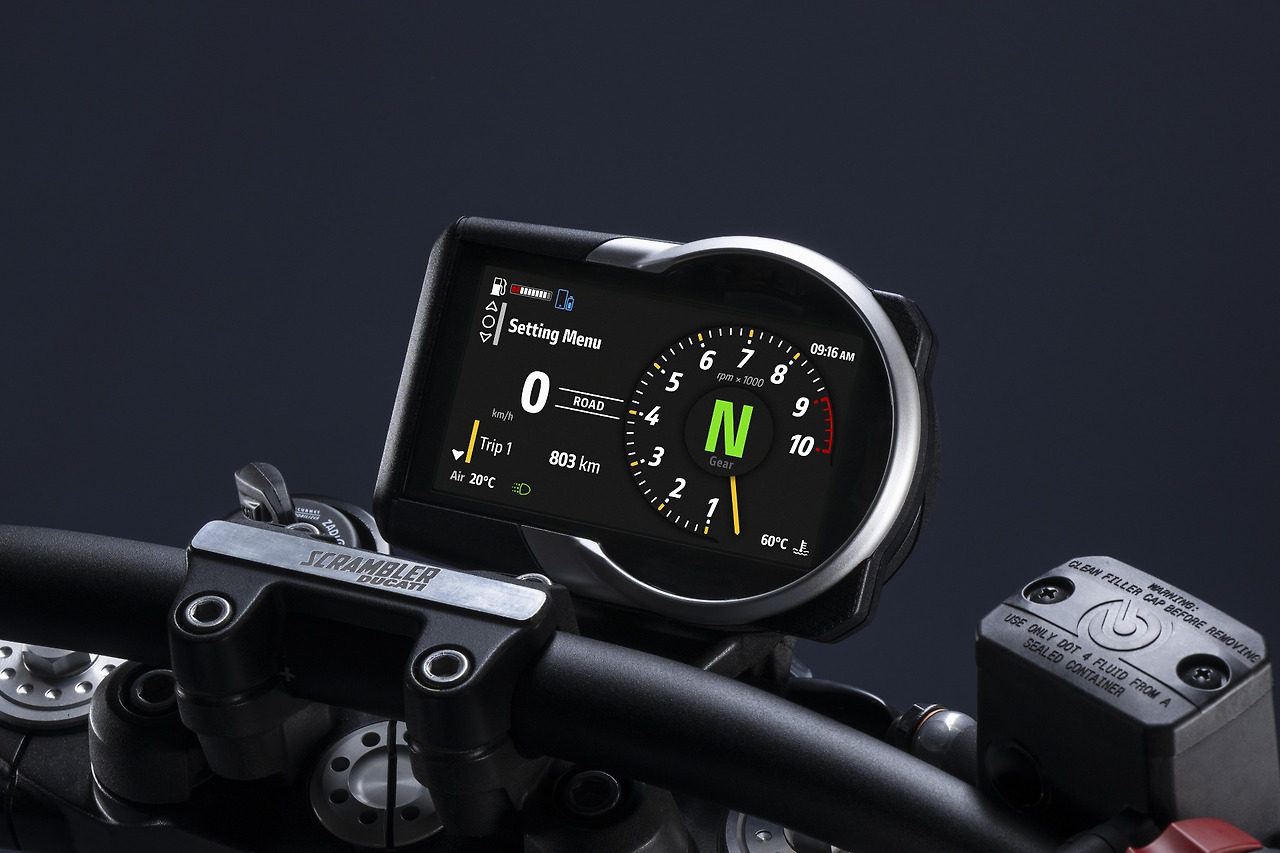 이번에 공개된 2세대 스크램블러는 모던 클래식 스타일이었던 1세대의 디자인을 더욱 발전시키는 한편 최신 디지털 기술을 적극 반영한 것이 특징입니다. 이전보다 더 날렵하게 디자인한 연료 탱크와 시트, 낮은 핸들 바와 현대적 감각의 휠 등 고전적 스타일을 이어받은 요소들이 눈길을 끌고, 직사각형과 원형 요소를 결합한 4.3인치 컬러 TFT LCD 계기판을 달아 현대화된 분위기를 냅니다. 아울러 두카티 퀵 시프트(DQS), 풀 LED 라이트(헤드라이트 및 주간 주행등, 테일 라이트) 등으로 새로운 감각을 더했습니다.