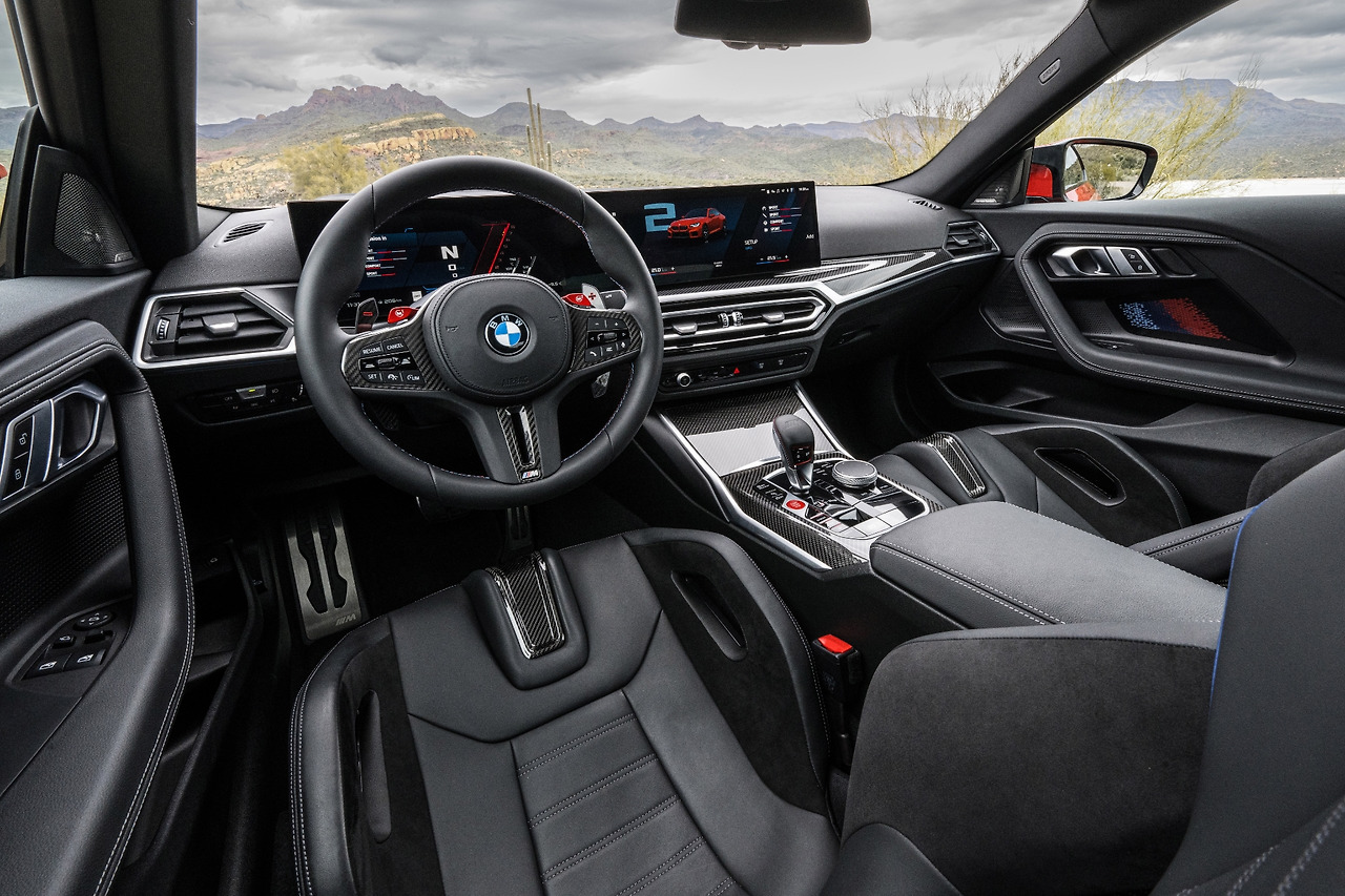 실내도 모터스포츠 이미지를 담아 꾸몄습니다. 대시보드 위에 놓인 BMW 커브드 디스플레이에는 트랙 주행에 도움을 주는 정보를 표시할 수 있는 M 전용 멀티미디어 인터페이스가 반영되었고, 대시보드와 도어 패널, 센터 콘솔 등 곳곳에 펄 크롬이 적용된 M 카본 파이버 인테리어 트림이 들어갑니다. 또한 탑승자의 몸을 잘 잡아주는 M 스포츠 시트와 M 시트 벨트도 기본 사항에 포함됩니다.