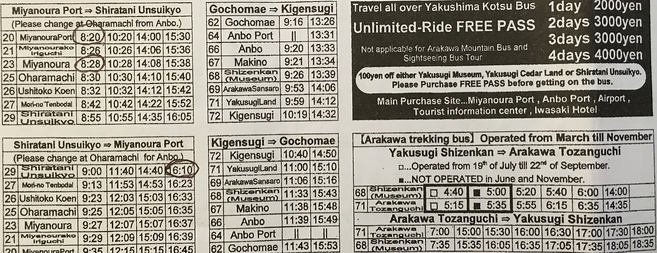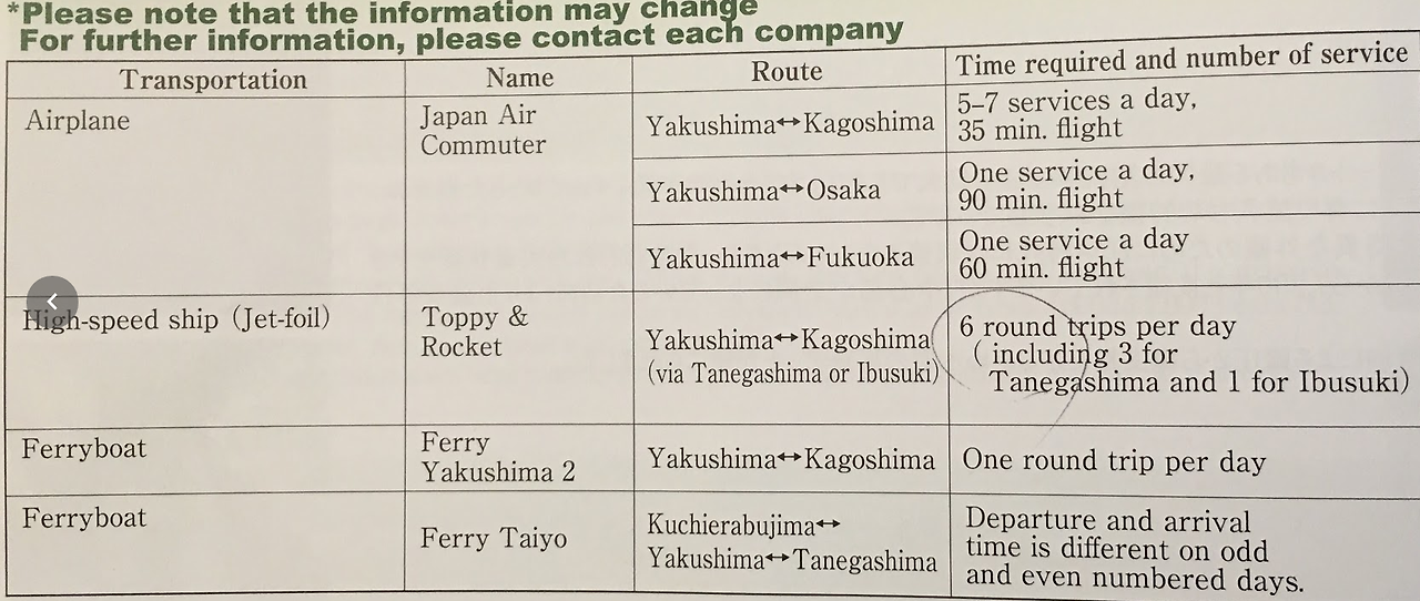 야쿠시마행 교통수단과 산행버스 시간표