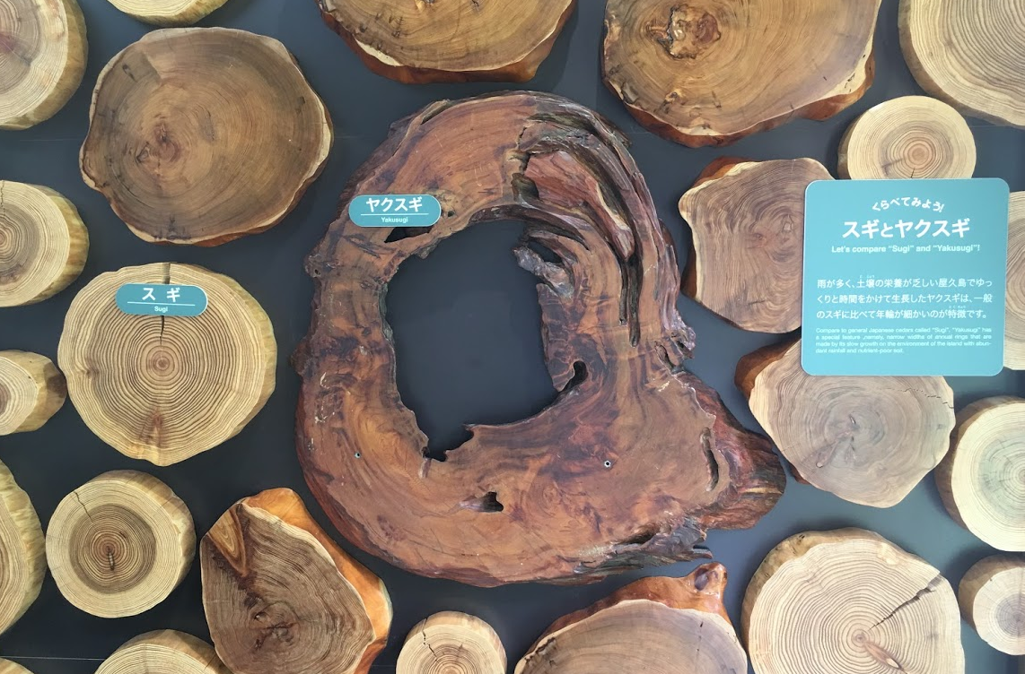 야쿠시마 여행은 야쿠스기라 불리는 1000년 이상의 수령을 가진 삼나무와의 만남이다. 일반 삼나무(스기)와 야쿠스기의 차이를 보여주는 단면