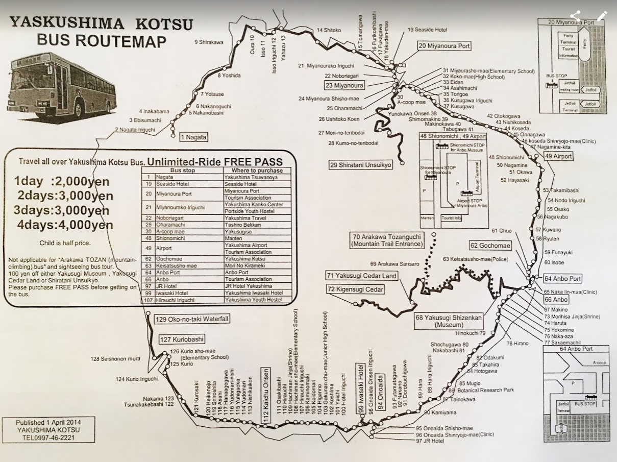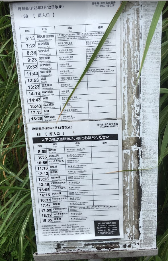 야쿠시마를 여행하면서 느꼈던 가장 아쉬웠던 점은 렌트를 하지 않으면 대중교통이 너무 불편했다는 것이다. 섬의 약 2/3, 개설된 제주도의 일주도로와 같은 해안도로가 마을과 마을을 연결하는 핵심 축이다. 야쿠시마의 대부분의 마을이 미야노무라항구와 야쿠시마 공항이 있는 남동쪽 연안에 있고 항구에서 시작해 종점이 대략 버스로 1시간 정도의 거리인 이 해안도로를 약 1시간에 1대의 버스가 왔다 갔다할 뿐이다. 그나마 교통의 중심이라고 할 수 있는 미야노무라항에서의 마지막 편은 저녁 6시 언저리다. 즉 저녁 6시 이후 다른 지역에서는 적어도 7시 전에는 렌트카가 없다면 이 섬에서 움직일 수 없다. 숙소로 정한 마을 부근에서 무료한 저녁시간을 보낼 수 밖에 없는 구조이다. 그것도 항구가 있는 미야노무라와 공항이 있는 안보 외에는 대부분인 작은 마을이라 변변한 식당도 귀하고 특히나 마트 등은 더 귀하다. 인구 13,000여명이고 지역주민은 대부분 자가용을 가지고 있다는 것을 생각하면 그리 나쁜 교통편은 아니지만, 지역의 관광수입적 측면을 고려하면 교통편을 조금 늦게까지 연장한다해도 나쁠 것 없는 것 같은데 말이다.