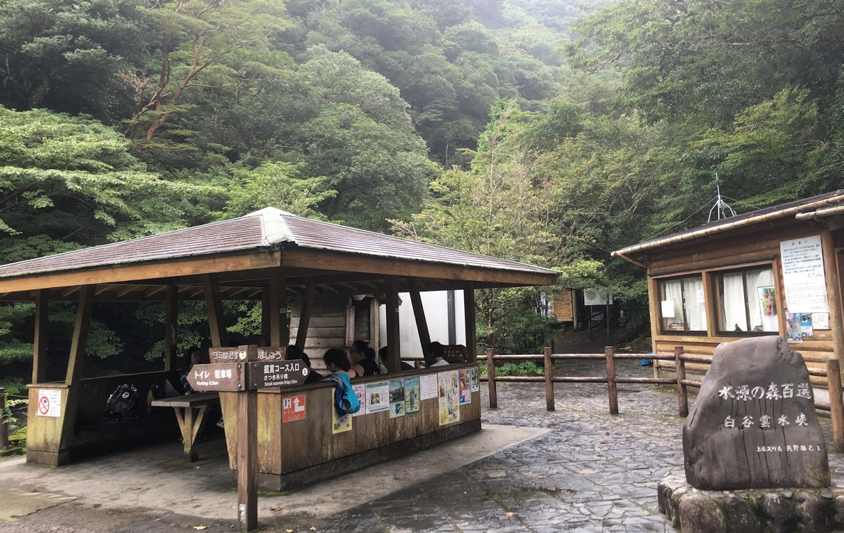 시라타니 운스이교행 중형버스와 명성에 맞지 않게 소박하기만 한 입구 매표소 풍경, 주차공간도 몇대 없다.