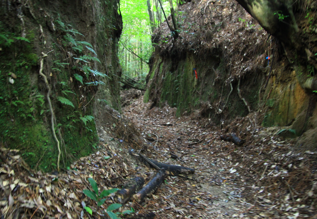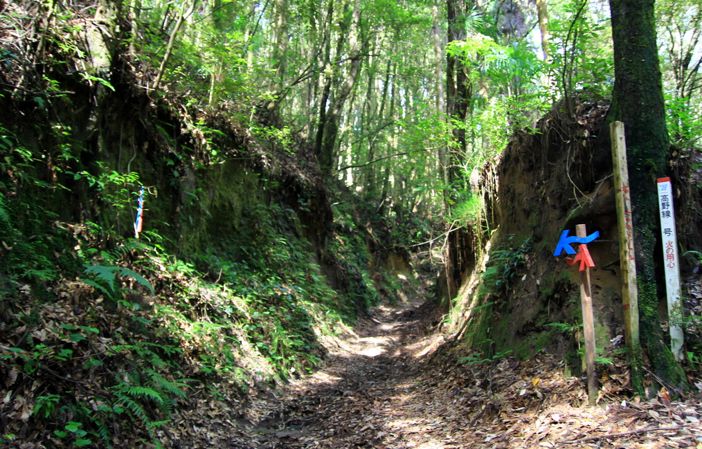 마을 벗어나면 본격적인 산행 시작, 그리고 이누카이노타기 폭포와 위압스런 임도로 사용되었던 숲길과 하천, 무너져 내린 흙더미가 때론 길을 덮치기 할 정도로 깊게 파인 산길이 이어진다.