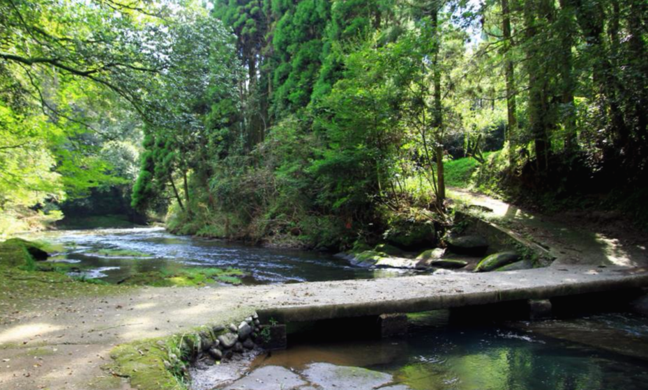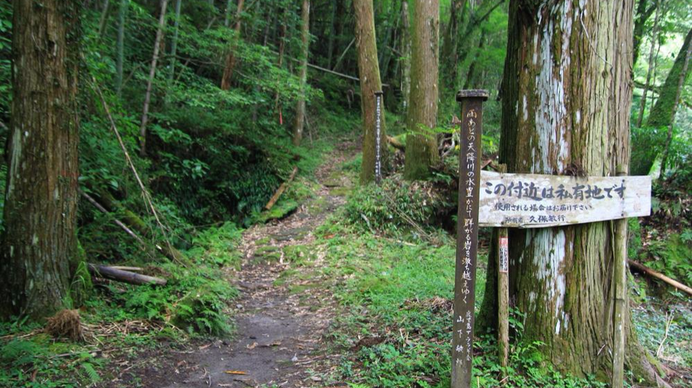 여유로운 발걸음을 따라 마을을 벗어나길 10여분, 본격적인 숲길이 시작되고 그 울창한 숲길을 만끽하려는 순간 나타난 이누카이노타기 폭포가 여행자를 반긴다. 작은 계곡에 고향 제주의 정방폭포만 한 웅장함을 자랑하는 폭포에 빠졌다. 여기까지가 이번 올레길의 마지막 파라다이스 일 줄은 그때까진 몰랐었다. 이후 한시간 정도의 계곡과 산길의 트레킹은 기리시마 산악의 울창함과 인적 없는 산길이라는 환경요인에 의해 심리적인 위축감을 느낄 정도의 깊은 산길이다. 코스의 대부분은 임도로 사용했던 길로 오랜 기간 동안 비바람에 깎여 사람 키보다 크게 움푹 들어간 길을 걷다 다시 산속 작은 마을과 아스팔트 포장도로를 보니 반갑기가 그지없다. 마치 무엇인가에 홀려 산속을 헤매다 나온 묘한 기분을 뒤로하고 마을 어귀 가을 이삭이 익어가는 논을 가로지르니 '료마의 산책길'이라는 표기가 올레 표식과 중첩되어 나타난다. 그 끝에는 와케신사가 있다. 여기 정도가 이 올레코스의 반 정도라 할 수 있다. 출발한 지 2시간여다. 그리고 이곳 신사 뒤로 이어진 길이 바로 '료마의 산책길'로 료마 공원의 시오히타시 온천까지 올레코스는 일본 역사인물 중 가장 인기 있고 최초의 허니문을 즐긴 사나이가 지났다는 길과 겹쳐진다.