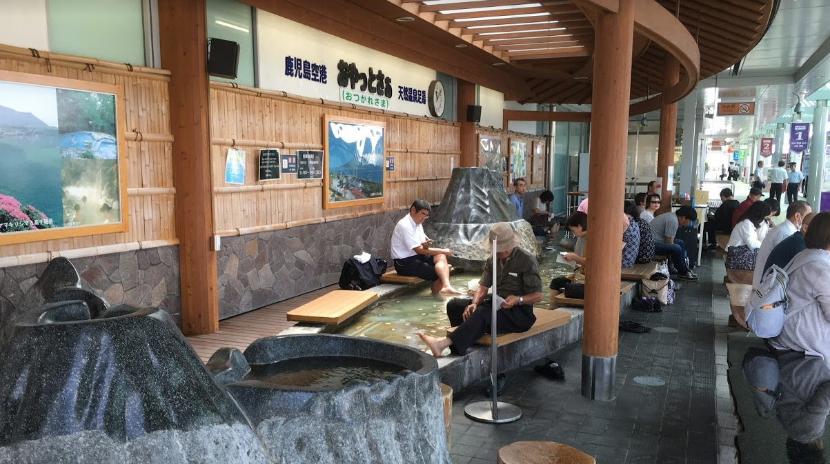 앞에서 언급했듯이 일본어에 서툰 나 같은 한국인 여행자가 기리시마-묘켄코스를 가기 위해서는 가장 쉬운 방법은 가고시마 공항으로 가는 것이다. 이번 규슈 여행의 유일한 목적이었던 '야쿠시마'를 다녀오기 위해 5박 6일을 보낸 나에게 한국으로 돌아가기 전까지의 4일이란 시간은 여유로울 수밖에 없었다. 가고시마 텐진에 자리한 도큐호텔에서 느긋하게 일어나 간단한 아침을 먹고 2-3분 거리의 공항버스 정류장에서 공항버스를 타고 한 시간 남짓 달려온 가고시마 공항에 도착하니 9시 30분 경이다. 이후의 아무런 정보가 없었기 때문에 공항 인포메이션 센터에서 규슈올레에 가기 위한 안내와 묘켄 온천과 시오히타시 온천행 버스 시간표를 얻고 나니 30분 정도의 시간적 여유가 있음을 알게 되었다. 시오히타시 온천은 공항에서 두 정거장으로 약 10분 거리이지만 묘켄 온천은 11 정거장 약 25분 거리, 가이드북에서 본 소박한 식당이 생각나서 묘켄 온천을 트레킹의 출발점으로 삼았다. 나중에 안 사실이지만 이 선택은 결론적으로 잘한 선택이었다. 료마 공원이라는 시오히타시 온천에는 온천 외에는 먹을만한 밥집이 없는 조그마한 공원이었기 때문이다. 묘켄 온천행 버스표를 밴딩 머신에서 390엔을 넣고 끊고 나서 나머지 시간을 오늘 하루 수고할 다리를 위해 공항 족욕탕에 발을 담그고 휴식을 취했다.