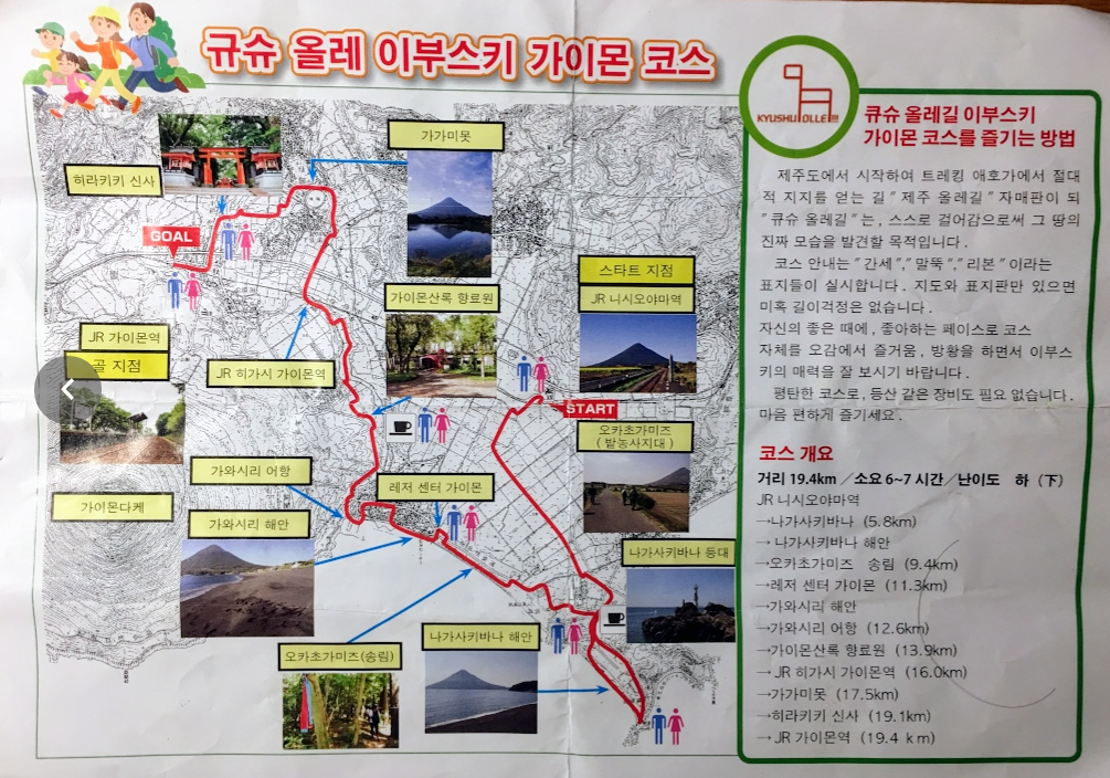 가고시현 공식 웹사이트에서 이부스키는 '아열대식물이 꽃을 피우는 휴양지로서, 옛날부터 온천이 많은 시골 온천마을'이다. 특히 이곳의 모래찜질 온천은 온천왕국 일본에서도 유일한 이부스키에만 있는 온천 형태로 일본 국내외 관광객에게 많은 사랑을 받고 있다. 규슈올레 이부스키 가이몬코스는 정확하게는 이부스키의 니시오야마역(西大山駅)과 가이몬역(開聞駅)을 각각 출, 종착점으로 하는 원웨이 코스이다. 즉 이부스키 시내가 아닌 외곽을 걷는 코스란 것을 이해한 가고시마에서 이부스키로 가기로 결정한 전날에서야 알았다.