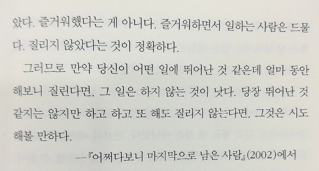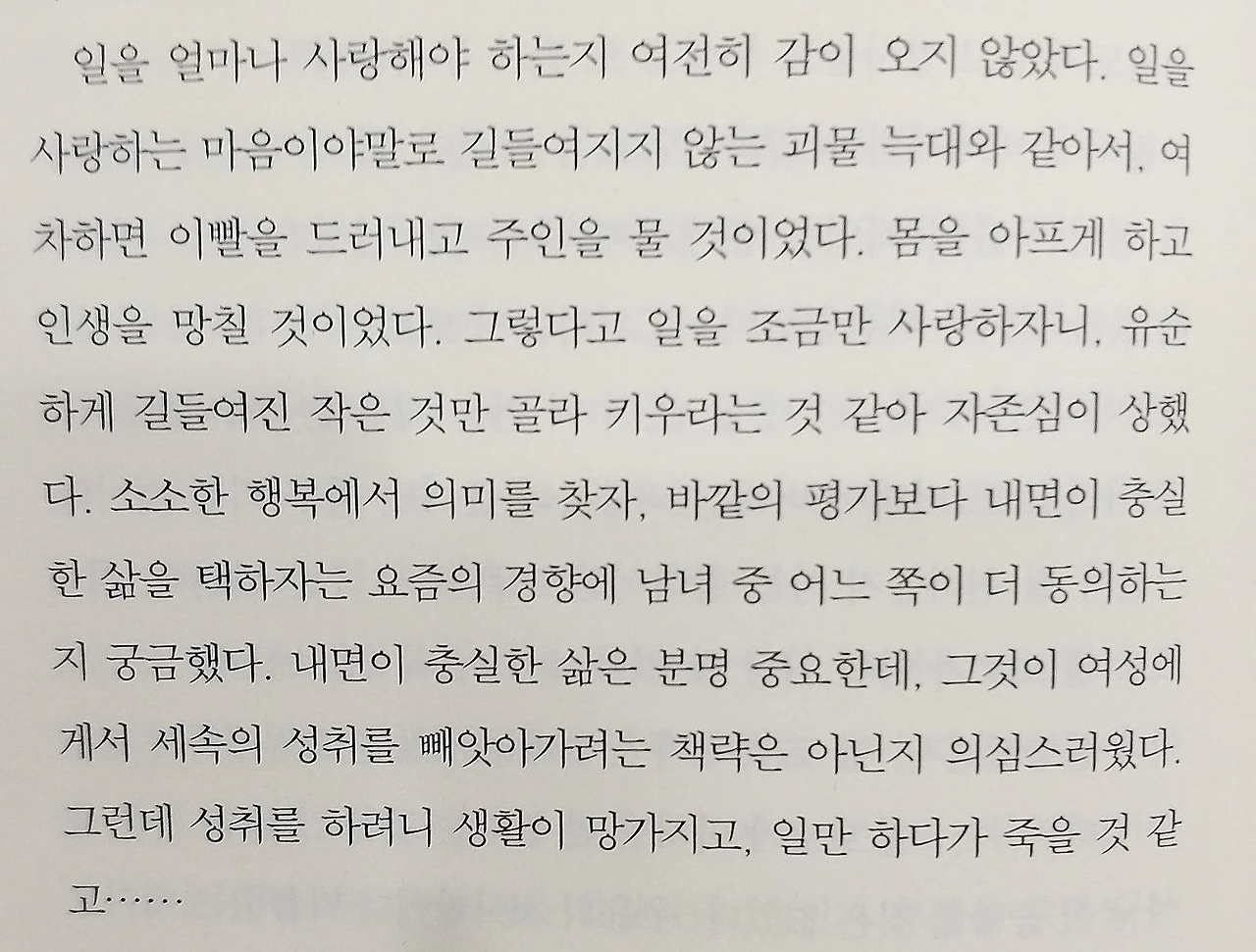 공감가는 장면이었다. 일을 얼마나 사랑해야 할까 가늠이 안 간다는.가끔은 일이라는 것과 아주 멀리 떨어져서 보기도 싫을 때가 있다. 그럼에도 꾸역꾸역 붙들고 사는 것은 왜일까.