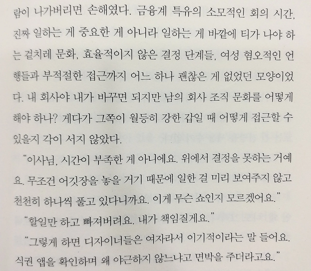 그게 아니고도 여전히 문제는 많다. 육아휴직계를 쓰고 복직한 많은 여자 직원들이 일하며 애를 먹는다. 시간표가 나오기 무섭게 애를 봐줄 사람을 찾는다. 매일 집과 회사를 왕복 4시간씩 오가며 육아하는 직원도 있다. 그러나 탄력근무제를 신청하려 했더니 윗선에서 막는다. 물론 모두 그런 건 아닐지 모르겠으나, 둘째라도 생기면 승진은 끝이다. 이곳이 유독 승진이 더딘 곳인것도 사실이지만, 그런 것을 감안하더라도 결혼하거나 아이가 있는 직원에 비해 아닌 직원의 승진이 더 빠른 것 또한 사실이다.