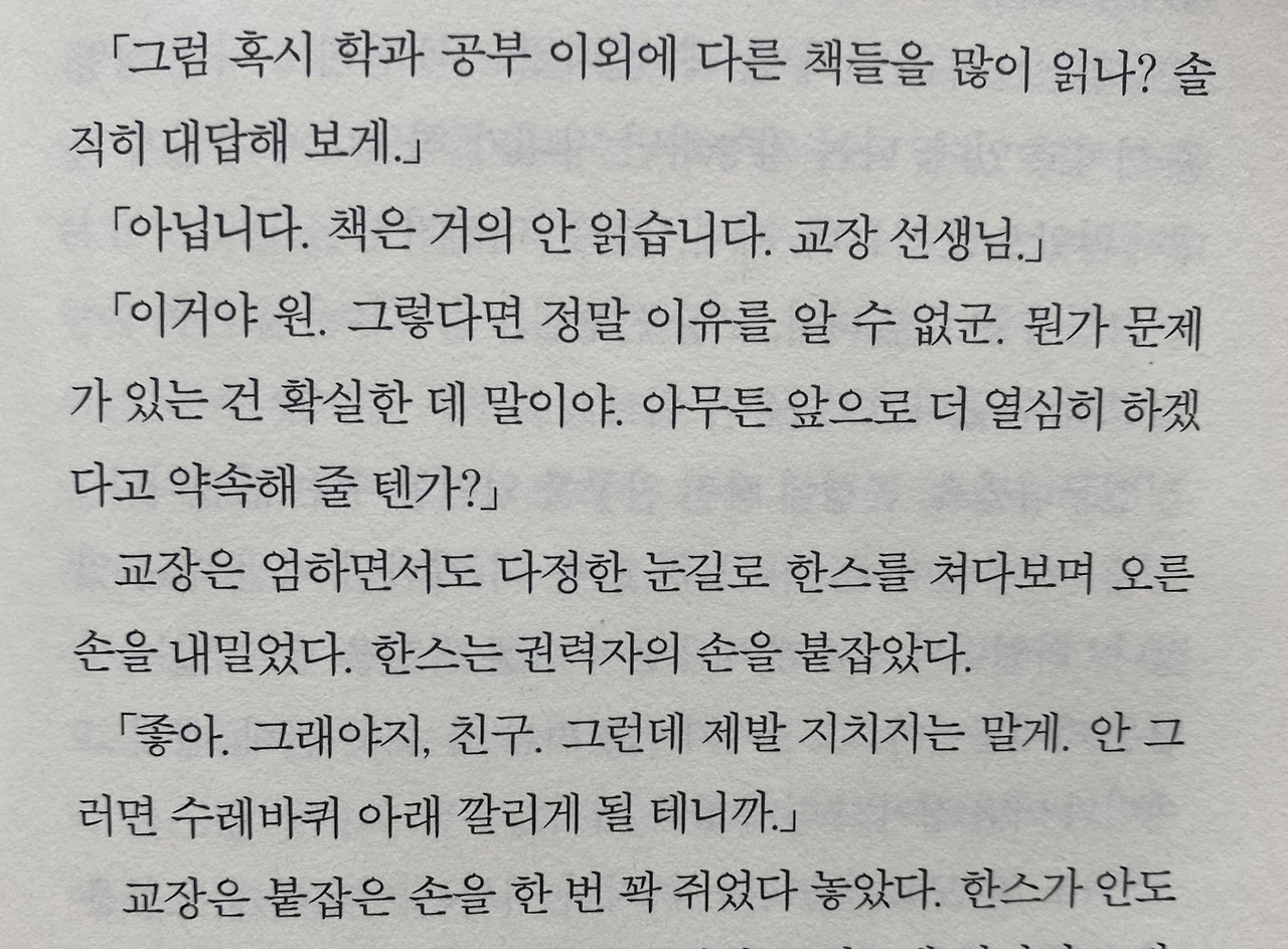 한스는 살아있다. 어른들이 바라던 모습대로는 아니지만 살아있다는 게 더 중요한 문제 아니겠나? 어른들도 아이들이 원하는 모습으로 살 수 없으면서, 아이에게 그것을 바란다는 것은 폭력이다.
