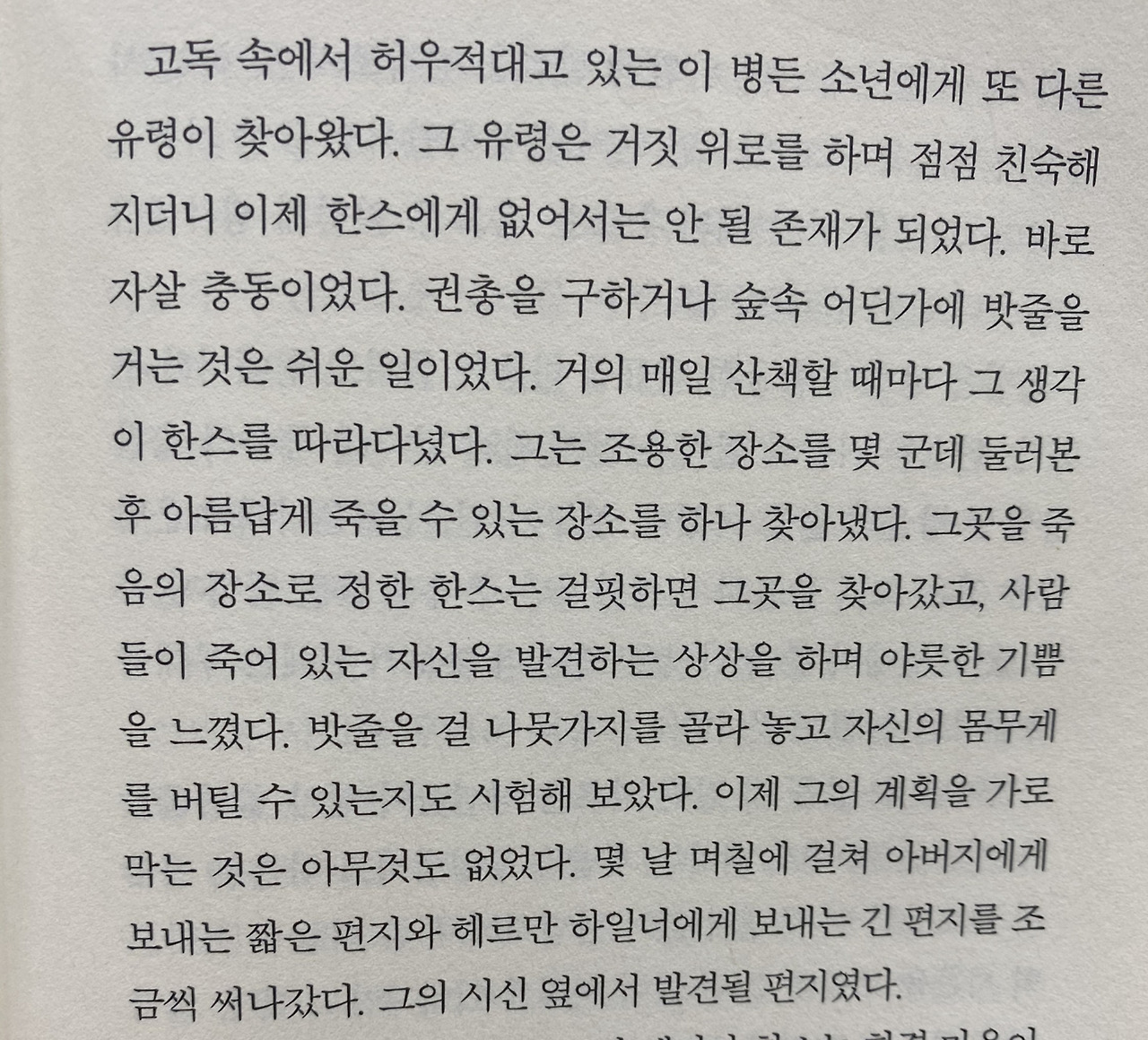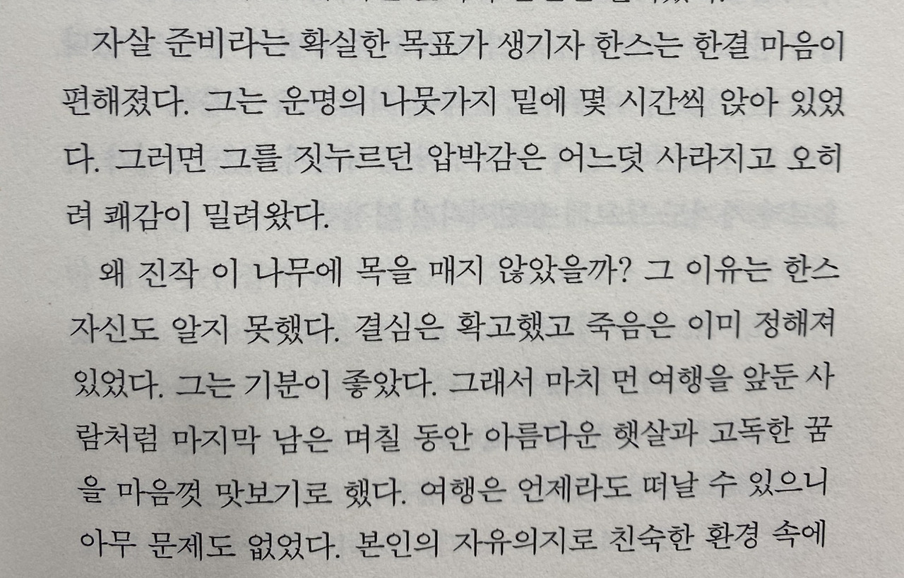 물론 수많은 한스들에게 모두 자살을 권하는 것은 절대, 절대 아니다. 그게 사고였다면 누구라도 한스를 구했을 것이고, 자살이었다면 한스를 말렸을 것이다. 그럼에도 불구하고 이미 죽어버린 그에게 남은 자가 할 수 있는 것은, 죽음이라도 한스가 원했던 것이었길 바라는 일뿐이다. 만약, 남은 여정을 보낼 의지가 있었음에도 사고로 죽어버린 거라면 한스가 살면서 자신의 의지대로 무언가를 이룰 기회조차 잃어버린 것이 아닌가.