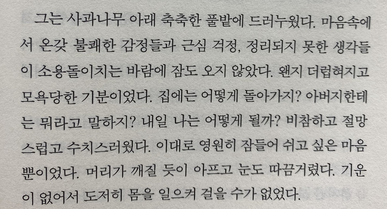 한스로 사는 동안 그리 불행하다고 생각해본 적이 없다. 그런데도 막상 한스로 사는 것에서 벗어나고 나니, 그 삶이 얼마나 끔찍했는지 알 것 같다. 이제야 실감이 난다. 한스로 사는 동안에는 미처 보지 못한 것들, 미처 느끼지 못한 것들이 보이고 느껴진다. 아마 이걸 모르고 살았으면 억울했을 것 같다.