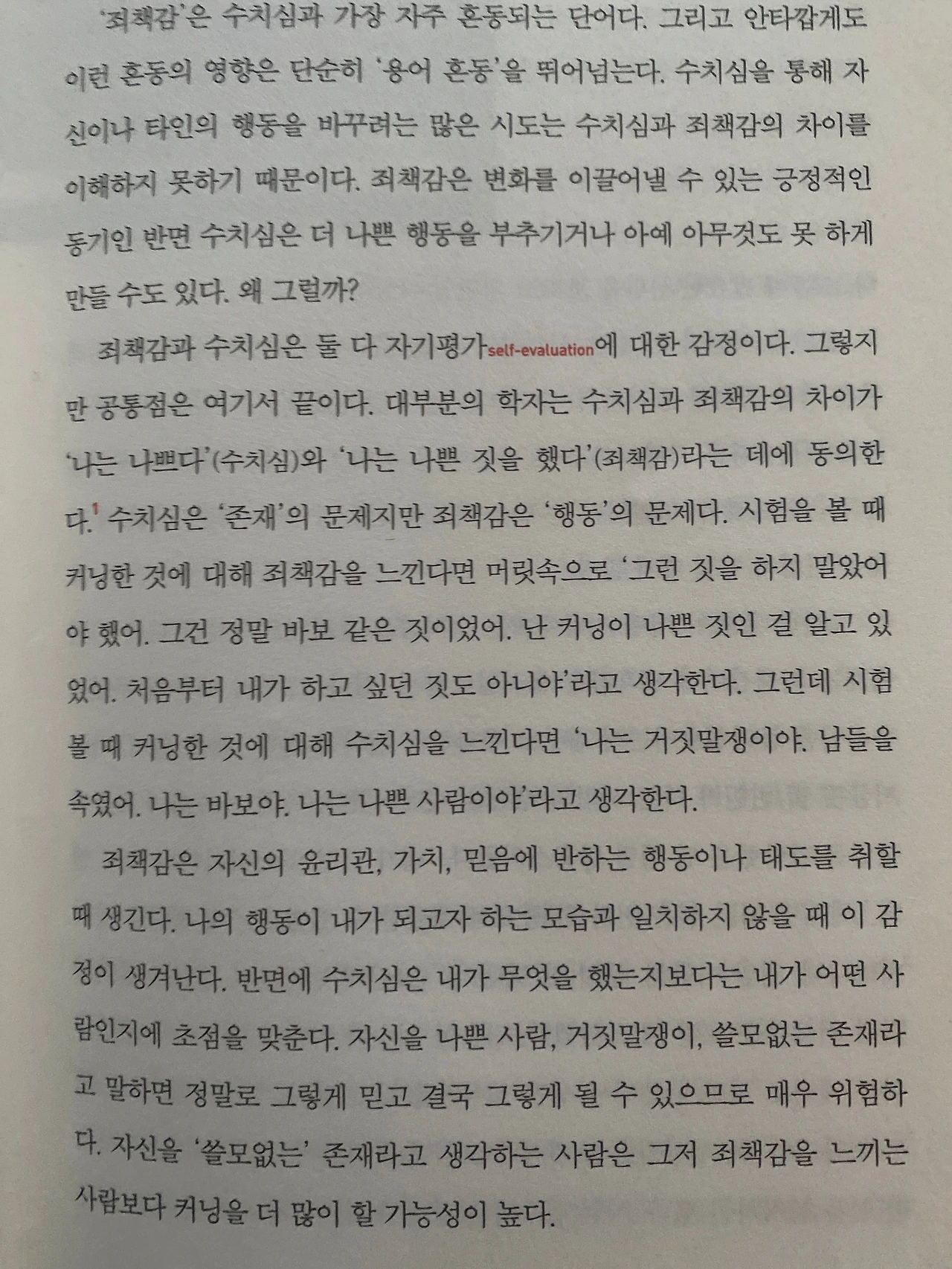 같은 행동을 두고도 죄책감과 수치심은 다른 생각을 하게 만든다. 사진에서 나와있듯이 죄책감은 ‘나는 나쁜 짓을 했다’는 생각으로, 수치심은 ‘나는 나쁘다’라는 생각으로 치환된다. 죄책감은 자신의 행동에 대한 책임감을 가지고 변화할 수 있게 만든다. 하지만 수치심은 자신에 대한 신뢰 자체를 잃어버리는 것이기 때문에, 어떠한 가능성도 내포할 수 없다.