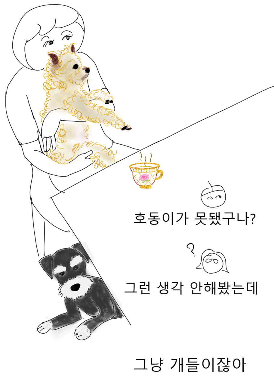 내 일 신경쓸 것도 많은데 개 두 마리 중 누가 잘나가는지 관심이 없을 수 밖에. 그런데 친구도 호동이를 더 예뻐한다. 물론 재동이를 소흘히 대하는 것은 절대 아니다. 사료, 간식, 옷 모두 똑같이 먹이고 입히고, 미용도 양치질도 똑같이 시키고, 재동이도 아프면 호동이처럼 재깍 병원에 데리고 간다. 내 눈에 보이게 티나는 점이라면, 호동이는 주로 친구 무릎 위에, 재동이는 의자 다리 옆에 앉아있는 것 정도다.