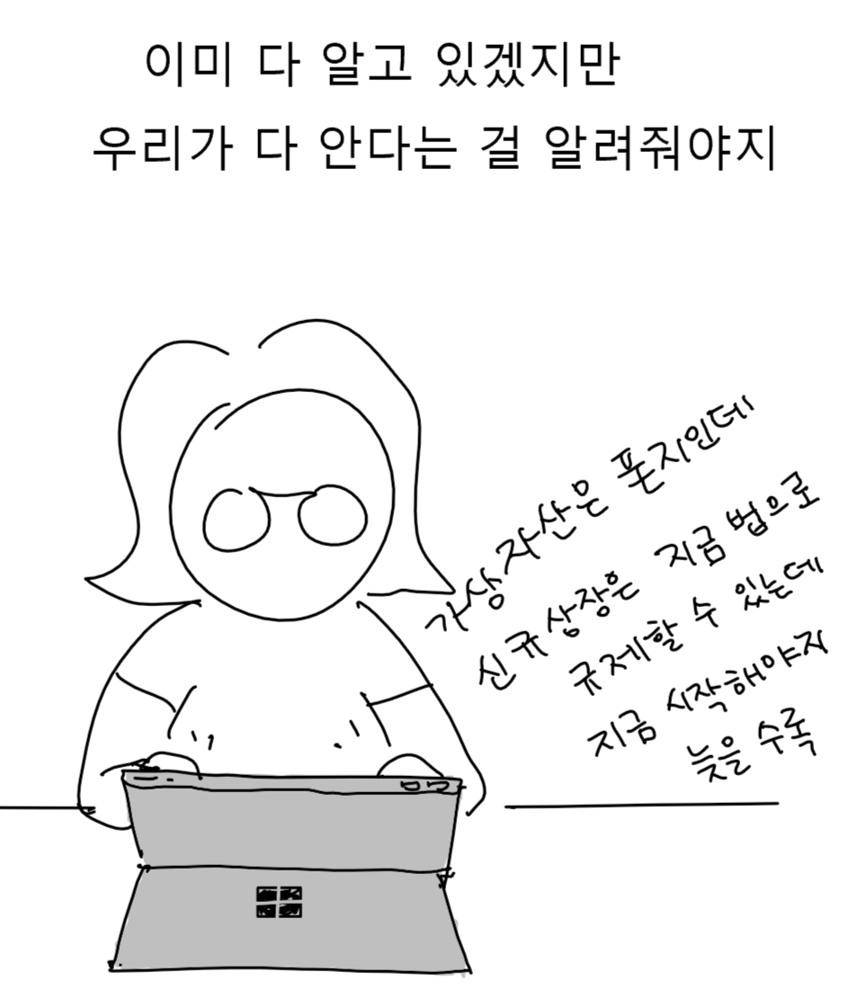 그러다 2023년에 테라, 김남국 사건이 일어나자 드디어 코인을 안하던 사람들이 관심을 가지면서 정부가 뭐하냐는 얘기가 나왔다. 이제 신규 코인 상장에 대한 규제가 임박한 것 같았다. 그런데, 와~ 정말 황당한 일이 벌어졌다. 업자들이 ‘가상자산 이용자 보호법’을 만들어서 ‘거래소가 이용자 예치금을 잘 보관해야 한다’ 같은 의미없는 내용을 넣더니, 신규 코인 상장 문제는 2단계 입법으로 나~중에 논의하자고 주장했다. ‘이용자’ 보호법은 말 그대로, 이용을 계속하게 해서 ‘거래소’ 사업을 보호하는 내용이다.