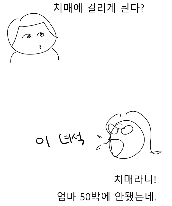 "엄마야, 이게 웬일이야, 이게 웬일이래요. 정신줄을 꼭 잡으려는 본인의 의지가 중요해요. 엄마는 예전부터도 워낙 깜빡거려서 치매로 보이는 적이 많았으니까...오히려 큰 차이 없이 쭉~갈 수도 있어."