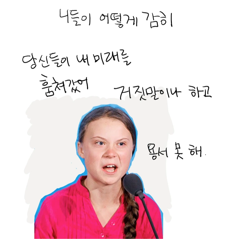 이제 21살이 된 스웨덴의 환경운동가, 그레타 툰베리. 때는 2018년 - 기후위기를 걱정하던 16살의 귀여운 아이는 UN 기후변화 당사국 총회의 초대로 각국 정치인들 앞에서 발언할 기회를 얻게 되었다.