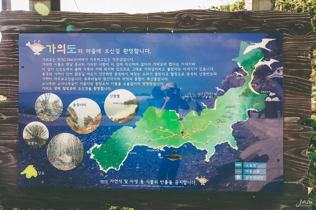 가의도는 면적 2.19㎢, 43세대가 거주하고 있는 비교적 작은 섬인데, 가의란 이름은 옛날 중국의 가의라는 사람이 이 섬에 살아서 가의도라고 했다는 설과 이 섬이 신진도에서 볼 때 서쪽의 가에 자리 잡고 있어서 가의 섬이라고 불렀다는 이야기가 전해지고 있다. 중국과 가까이 있어 맑은 날 파도가 잔잔하면 중국에서 개 짖는 소리가 들릴 정도라고 하는데 솔직히 그 정도로 가까워 보이지는 않는다. 중국의 산둥반도와 소나무, 그리고 소사나무숲이 아름다워 탐방로의 이름을 소솔길이라 지었다고 한다.