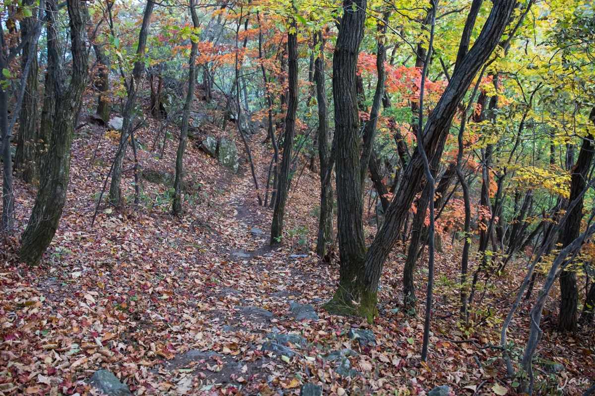 나는 철마산 북봉(내마산)에서 잠시 휴식을 취하고 주금산으로 연결되는 능선길을 따라 이동하기 시작했다. 능선길이지만 이래도 되나 싶을 정도로 내리막길이 많다. 그만큼 오르막길을 만나야 하기에 나는 정상으로 가는 내리막길이 달갑지 않다. 그래도 이따금 만나는 푹신한 낙엽길을 따라 천천히 걷다 보면 기분이 묘하게 즐거워진다.