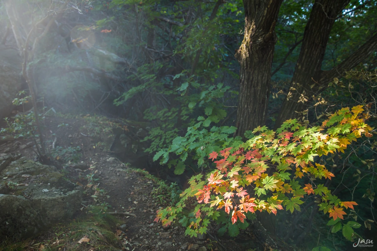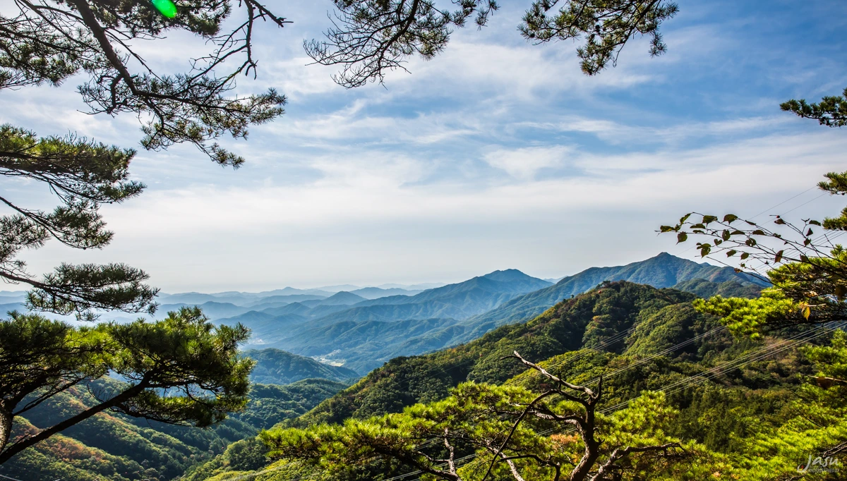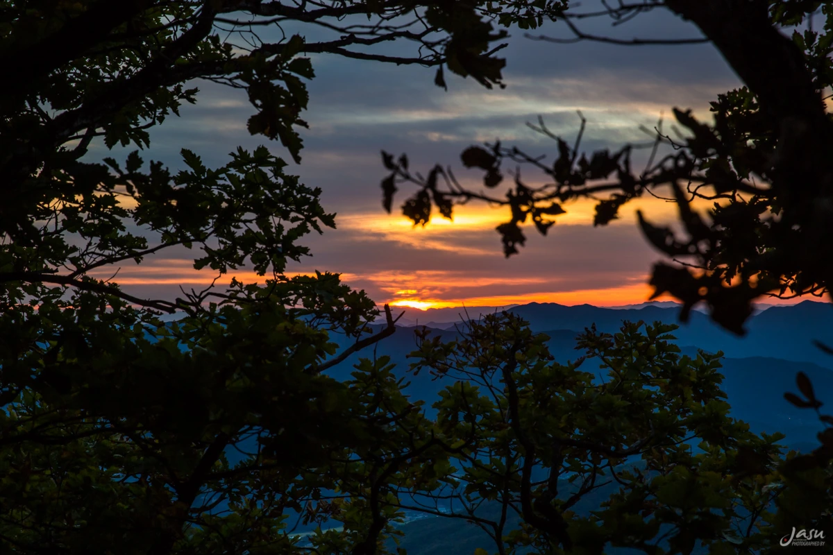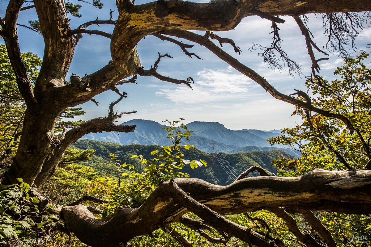 북봉으로 가는 도중에 나무 사이로 찍은 사진이 유일한 일출 사진이다. 철마산 남봉에서 북봉으로 가는 길은 험하지 않지만 넉넉하게 1시간 30분 정도 예상하고 출발하는 것이 좋겠다.