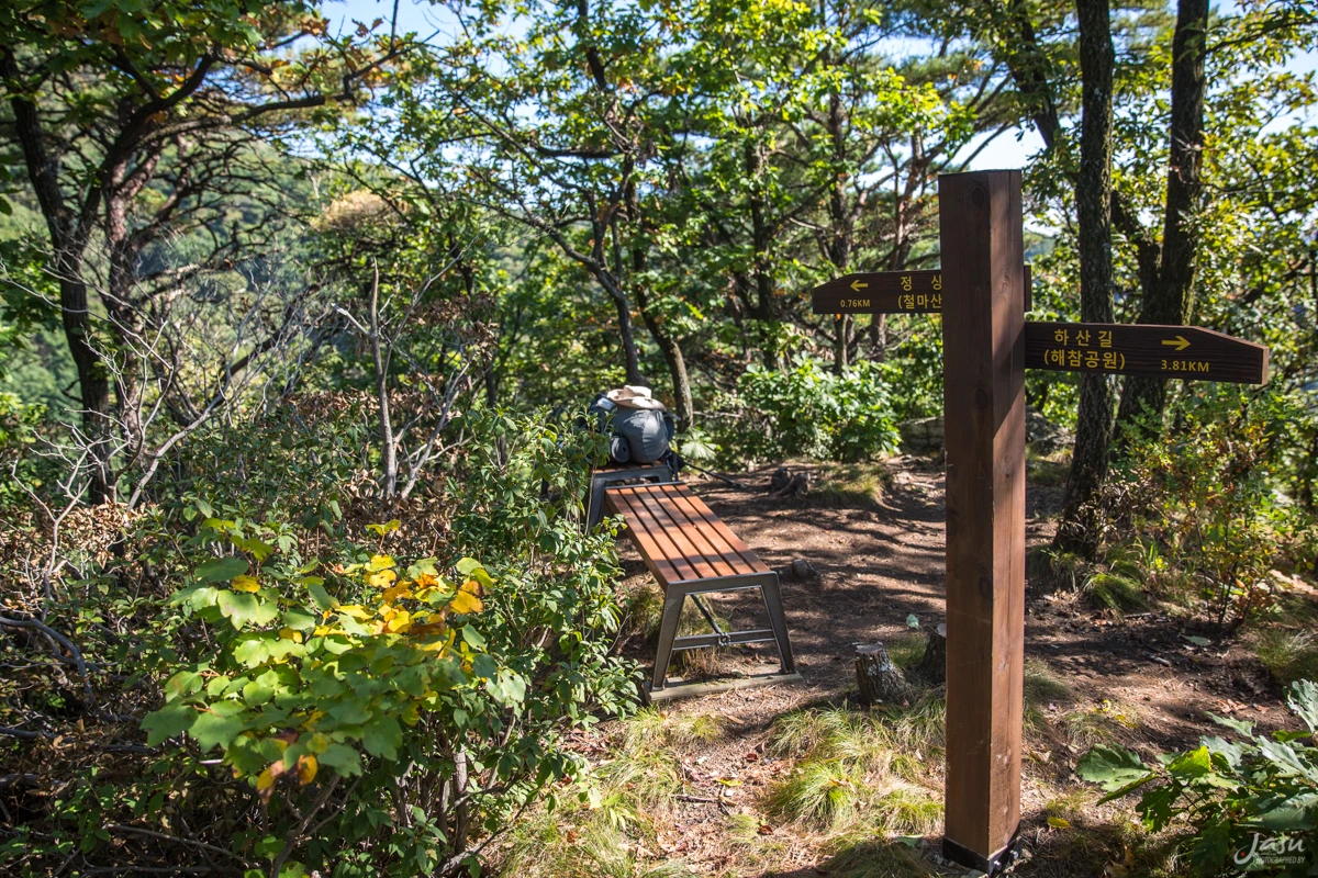 예상보다 배낭을 꾸리는 시간이 오래 걸렸다. 바람이 많이 불어 텐트 접는 시간이 오래 걸린 탓이다. 나는 5시가 조금 넘은 시각에 출발했다. 지도에 철마산 북봉(내마산)에 대한 정보가 없었고 어두운 산길을 걷다 보니 예상보다 늦게 도착하게 되었다.