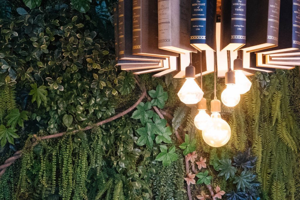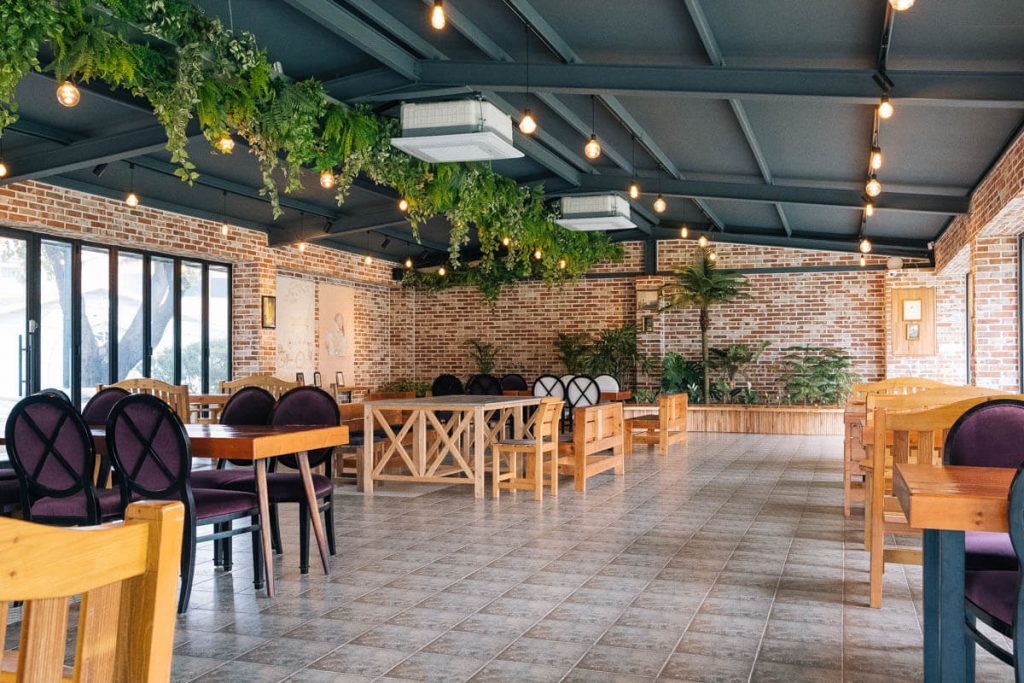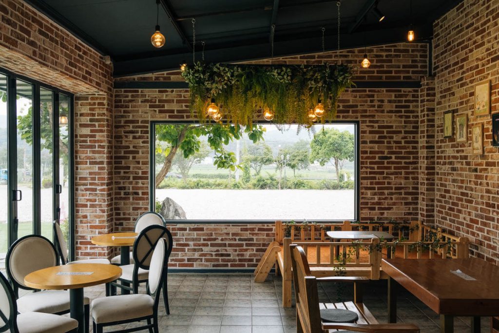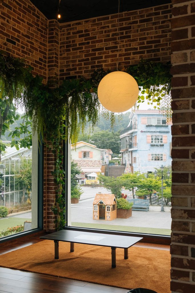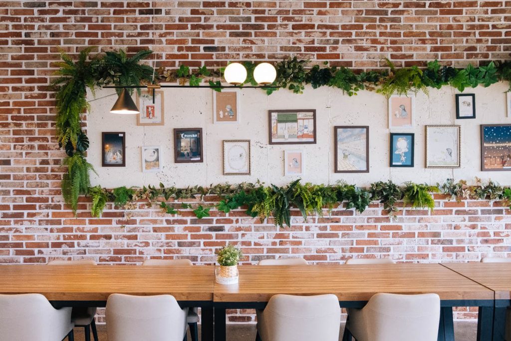 따듯한 느낌인 벽돌집 콘셉트에 나무로 구성된 테이블 세트. 곳곳에는 아이를 배려한 의자가 놓여있다. 천장과, 바깥 창에는 벽면 녹화처럼 식물을 포인트로 자연 진화적인 모습을 연출했다. 전체적으로 은은한 주황색 조명은 따듯하고 안락한 분위기를 더했다. 진주 모양의 볼 조명이 있는 2층은 인증 사진을 남기려는 손님으로 북적였다. 드라마 촬영으로 인기 있는 대여 장소다 보니 입간판에 촬영 장면도 보였다.