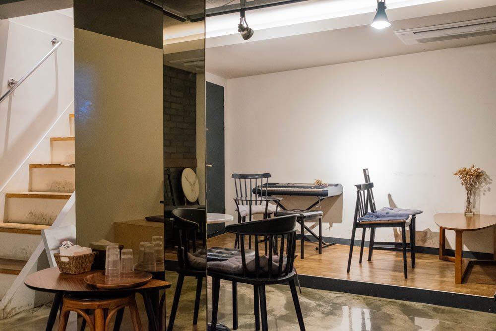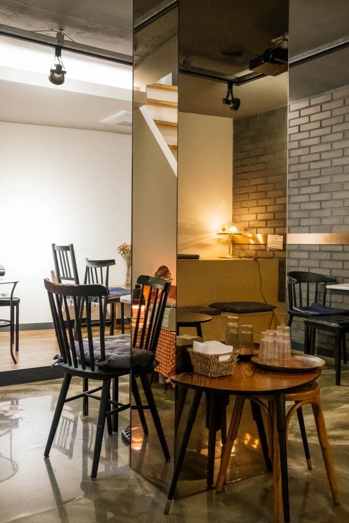 계단으로 내려오면 지하 공간이 펼쳐진다. 신발을 벗고 올라갈 수 있는 좌식 의자가 있고, 거울 기둥으로 오밀조밀 모여 있는 테이블로 넓은 공간을 더 입체적으로 보이게 했다. 하얀 벽을 배경으로 상영되는 무성 영화는 조명이 은은한 지하 공간에서만 누릴 수 있는 BAR 분위기가 느껴진다.
