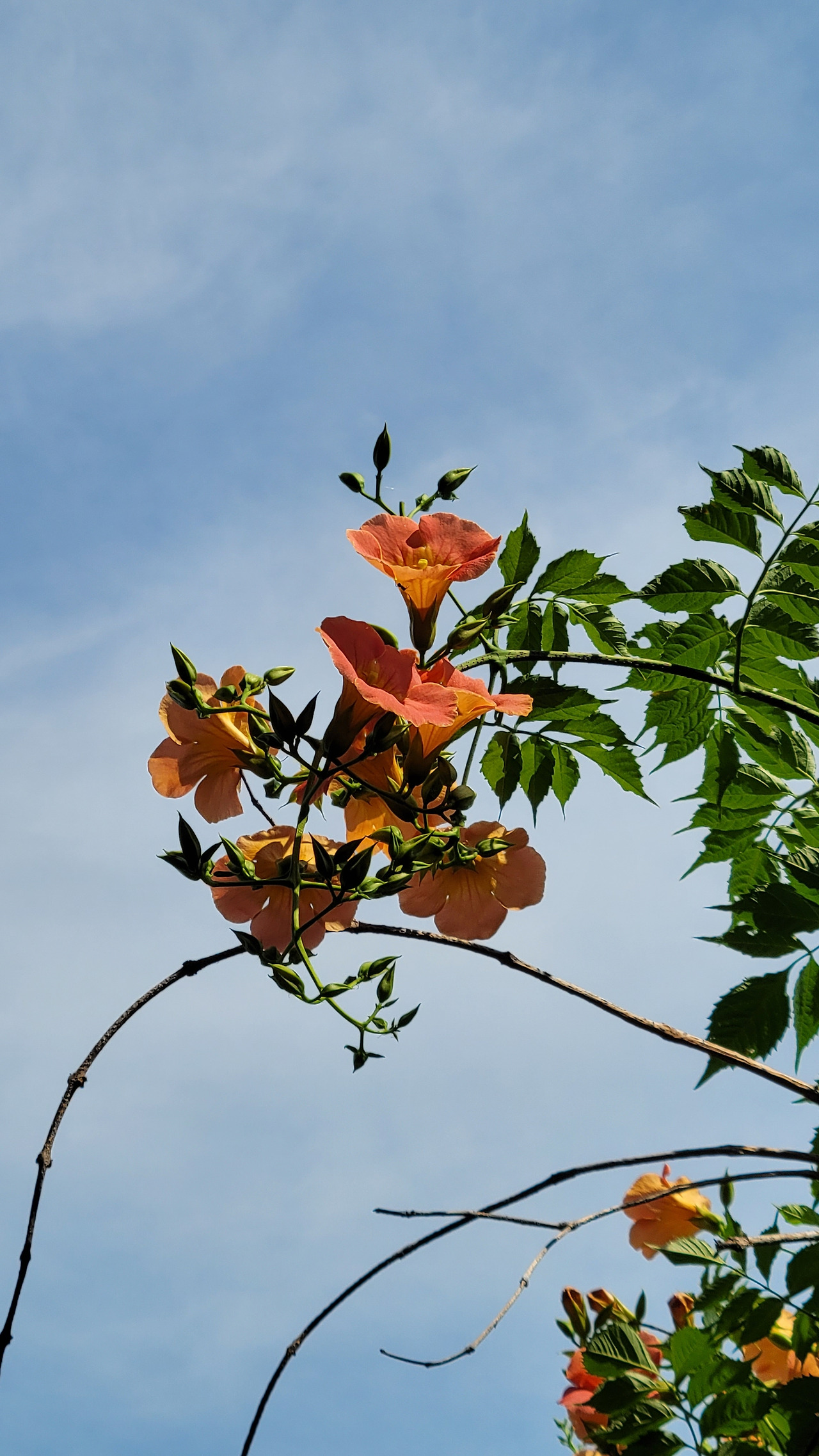 능소화는 기찻길 옆 담장이나 고속도로와 아파트 사이 방음벽에서도 자주 볼 수 있다. 고속도로를 달리는 차 안에서 높은 담을 뒤덮은 꽃을 볼 때면 박상천 시인의 <능소화>라는 시가 생각난다. 시인은 고속도로 저편 아파트 담장에 심은 능소화가 웅웅거리는 소리가 궁금하기도 하여 소음차단벽을 타고 이쪽 세상으로 넘어왔다고 했다. 그러니 뿌리내린 세상과 꽃을 피운 세상이 다른, 참 특이한 꽃이라고. 여름의 능소화 줄기는 무성한 잎과 꽃송이로 뒤덮여 잘 보이지 않는다. 그래서 줄기는 비가 오면 생기는 연못처럼 잎과 꽃이 져야 드러난다.