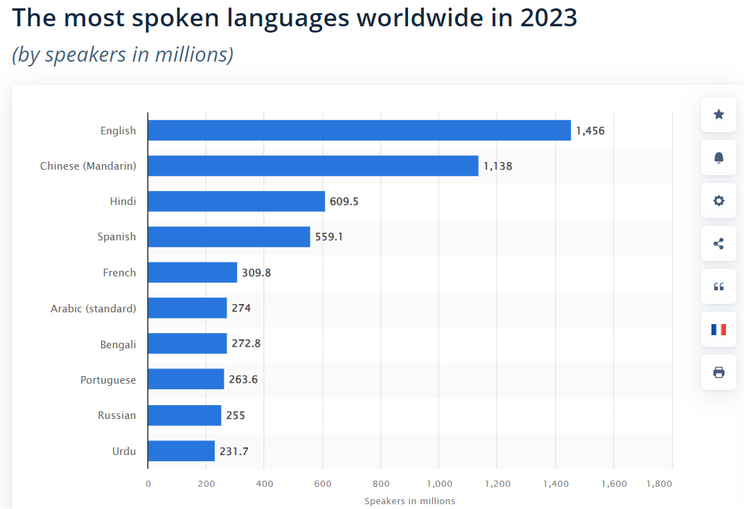 영어 사용자수가 15억명 밖에 안 된다는 건 좀 납득하기 어려우나... https://www.statista.com/statistics/266808/the-most-spoken-l