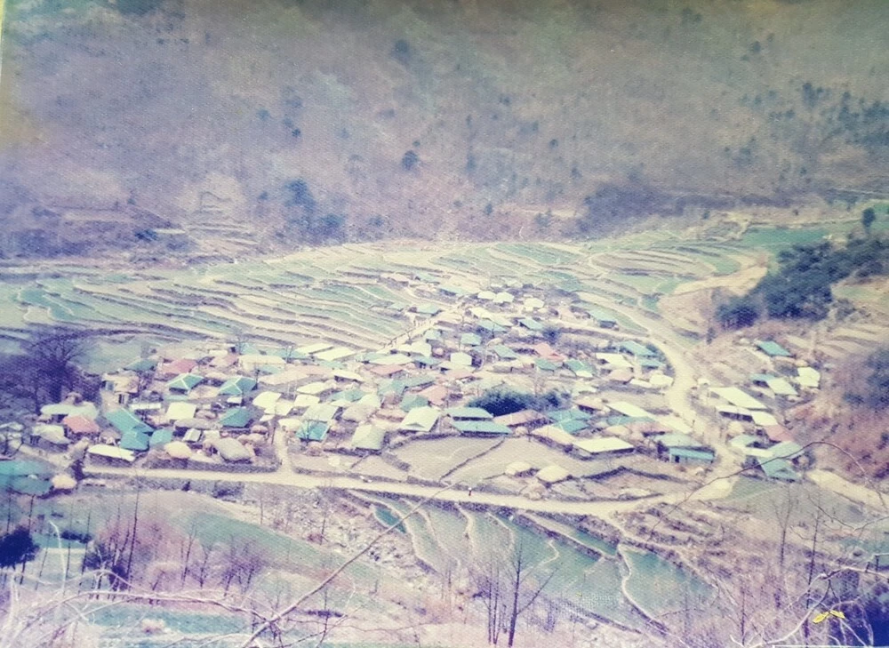 맨 오른쪽 언덕배기 파란 양철 지붕 옆 초가가 우리 집이다. 이건 그나마 꽤 많이 개량된 1980년대 말의 모습이다.